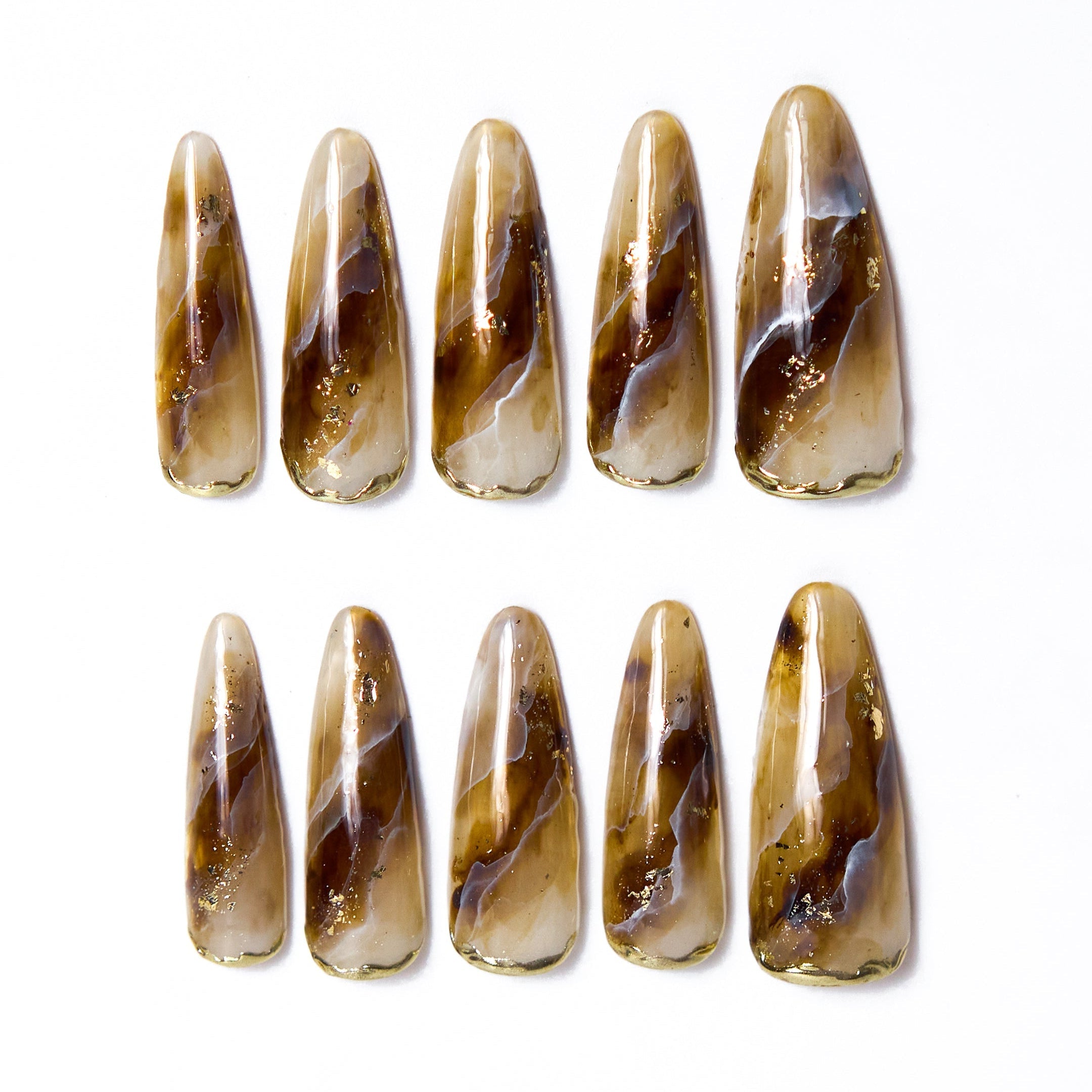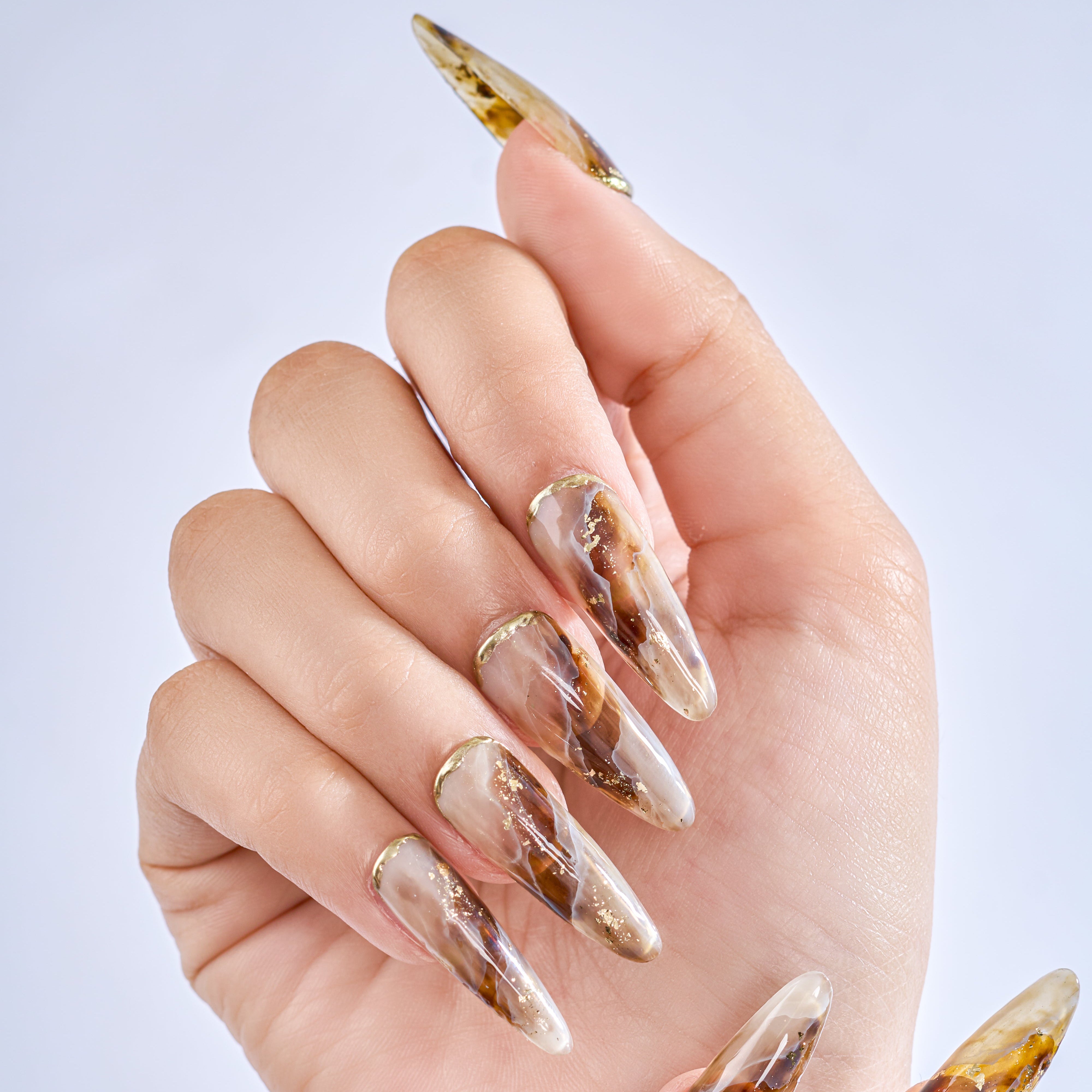 These nails feature a unique, smoky marbled effect with a blend of translucent beige and rich dark brown tones, creating a mesmerizing depth. Delicate gold accents trace the cuticles, adding a touch of luxurious detail.