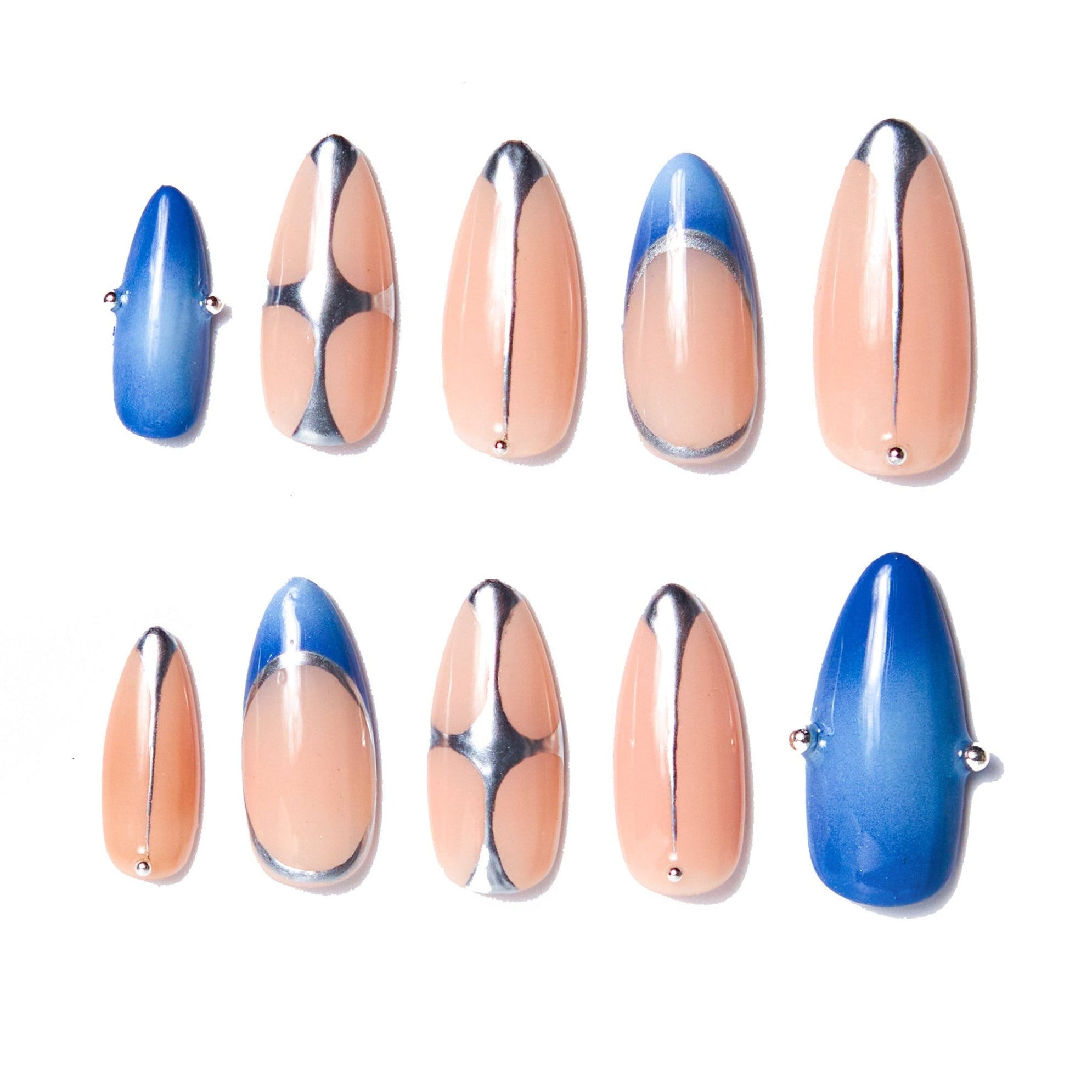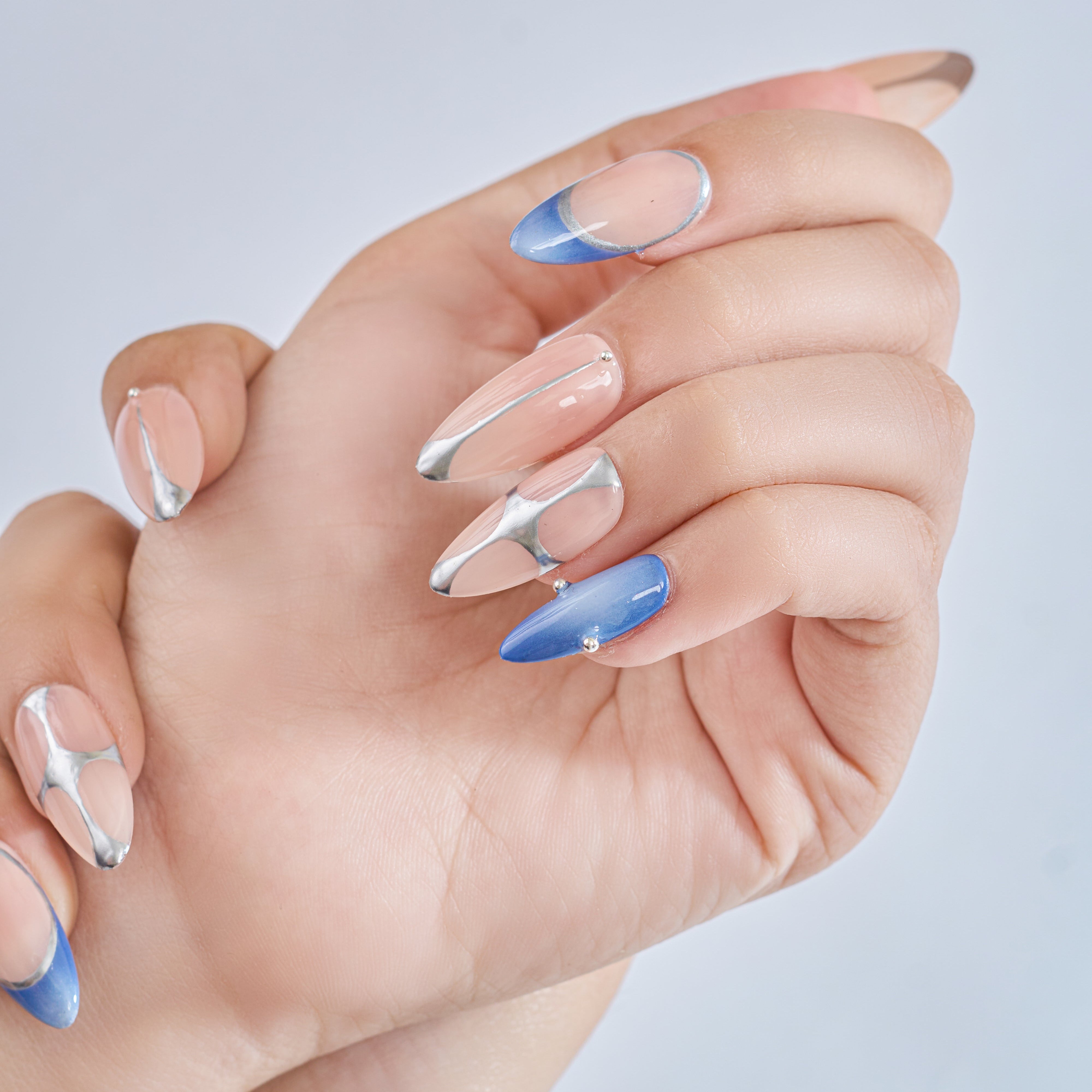 These nails feature a unique design, combining a soft, neutral base with striking blue and silver accents that create a captivating, almost futuristic look. The sculpted silver lines and bold blue tips add a touch of contemporary edge, while maintaining a sense of refined femininity.