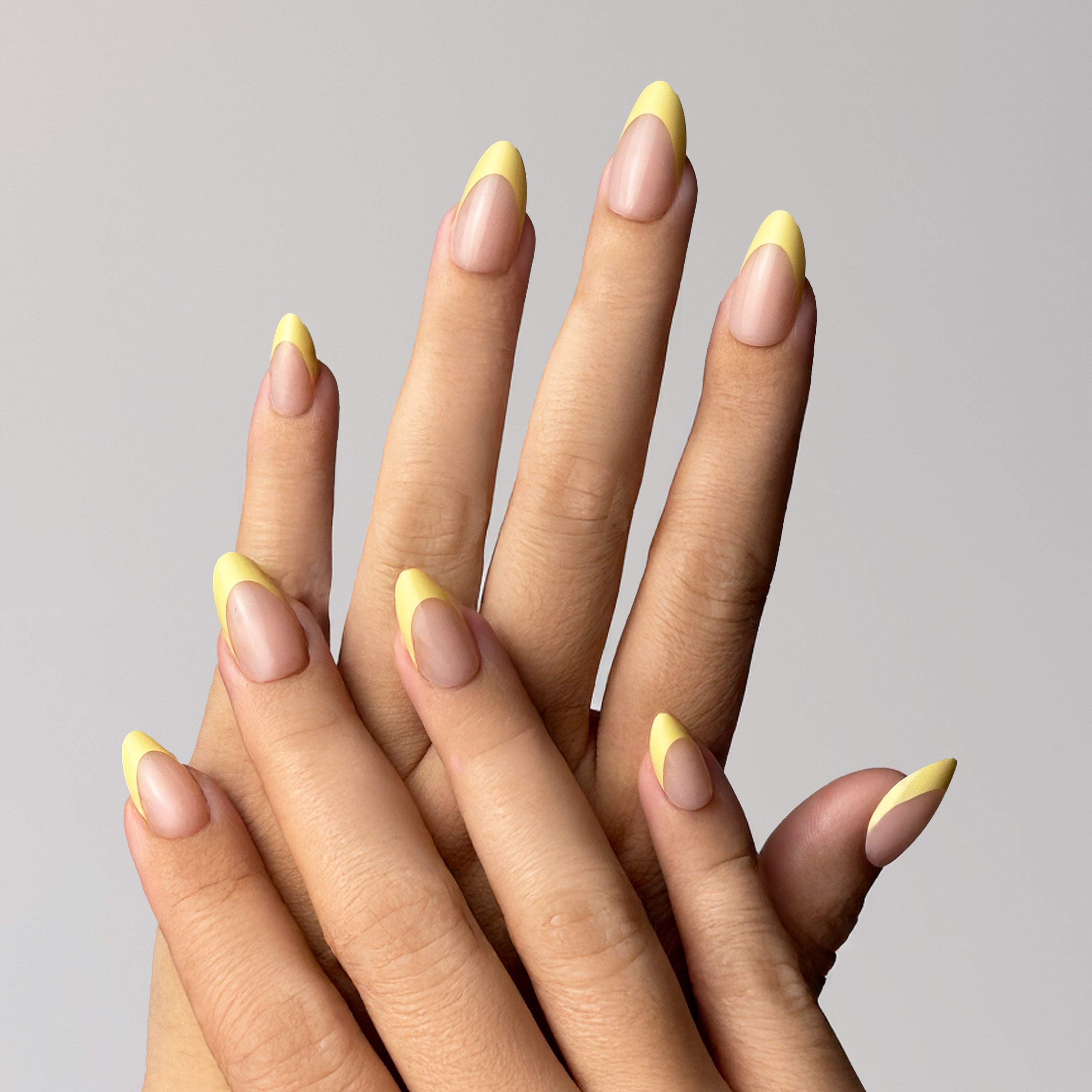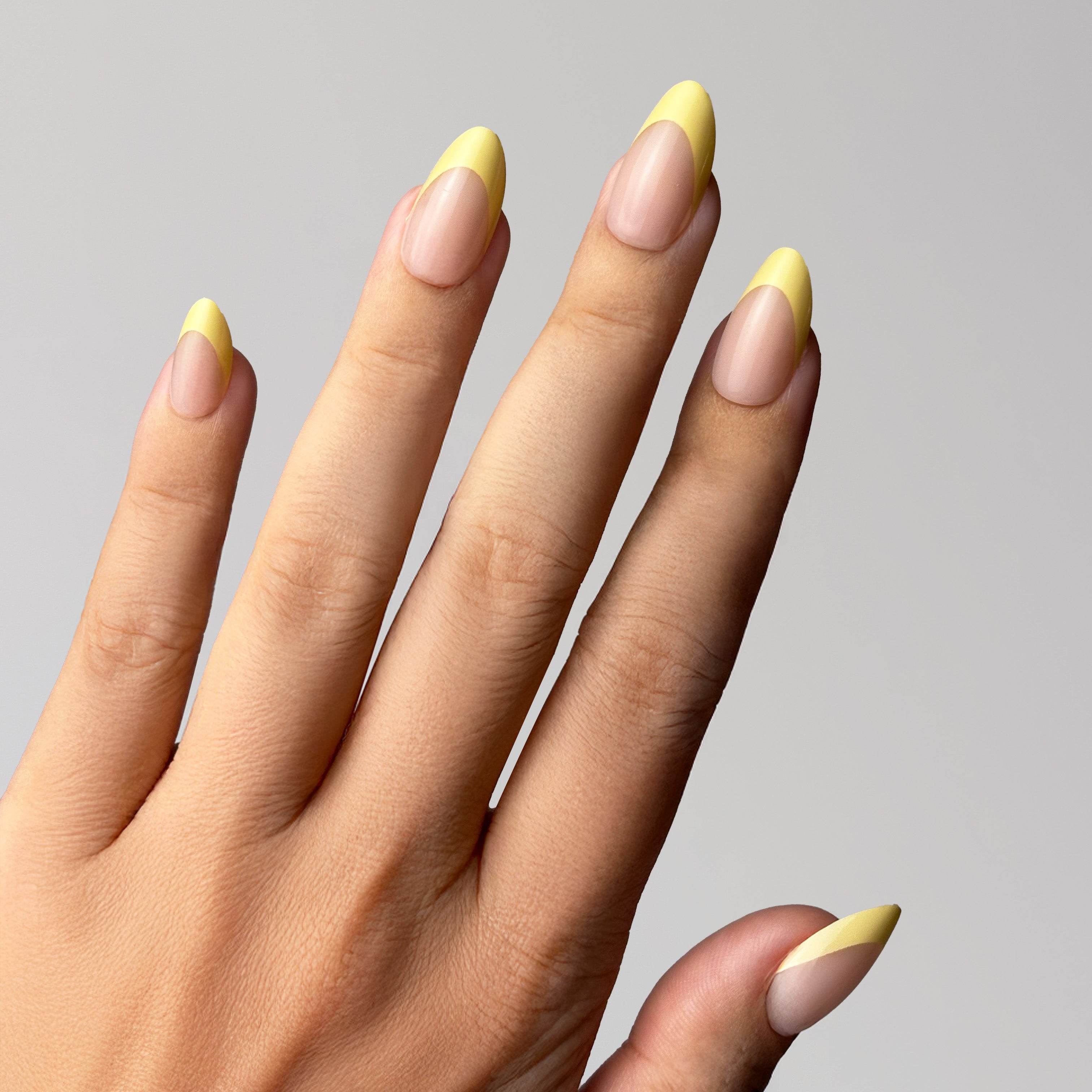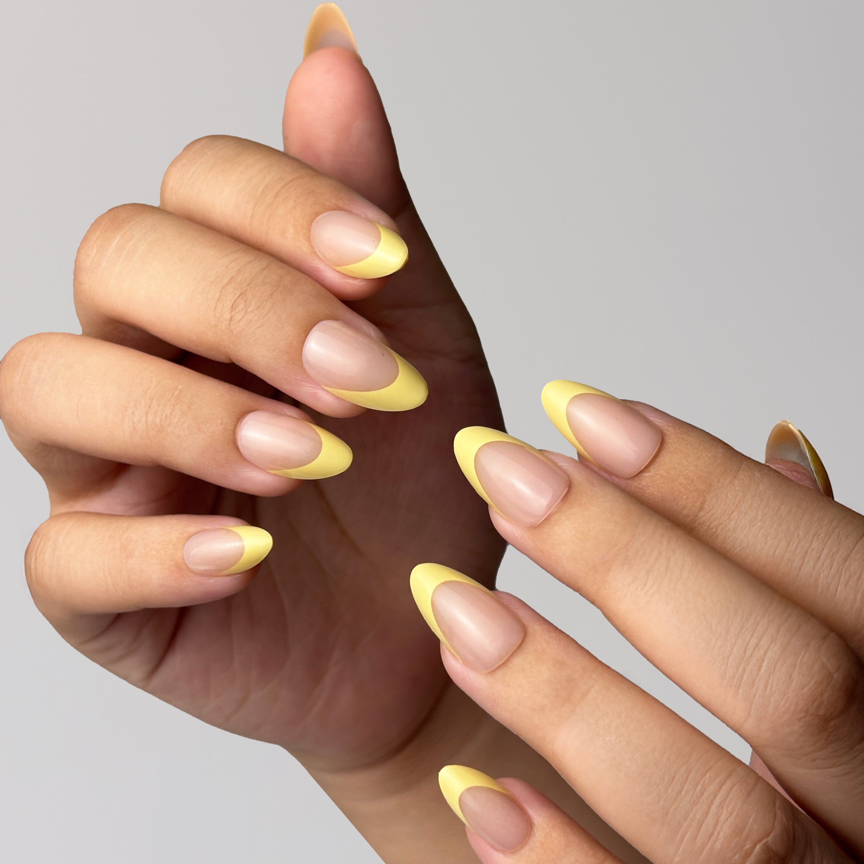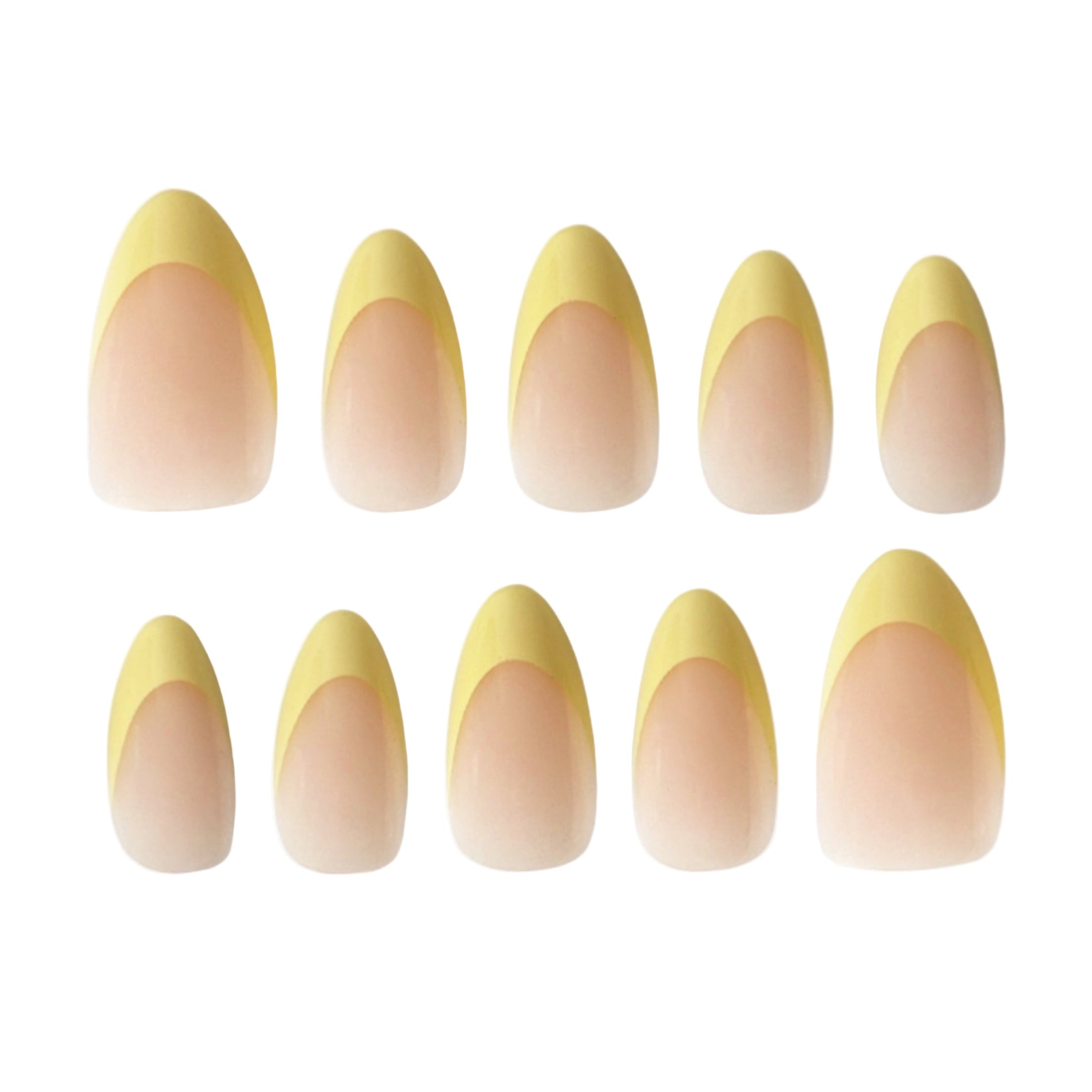 A unique French ombre design featuring a natural nude base combined with a cheerful butter yellow gradient at the tips. This bright and youthful color brings a fresh twist, ideal for those who want to express their creativity and unique style.