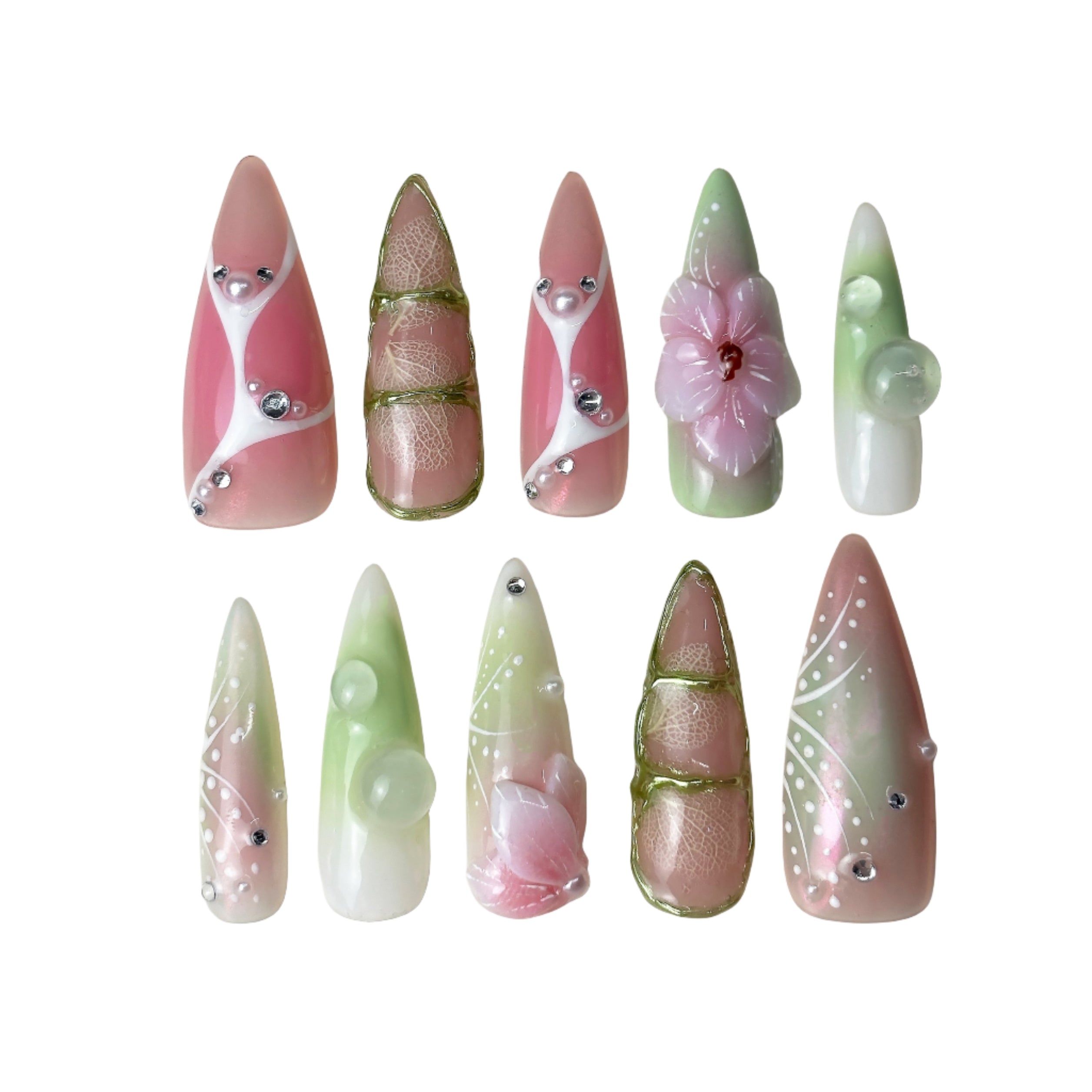 A unique handcrafted design with a dominant pastel green color, harmoniously combined with vibrant pink and yellow accents. Each nail is a miniature work of art with intricate petal, leaf, and shimmering crystal details, like morning dew. This set is a perfect representation of cottagecore nails and garden nails.