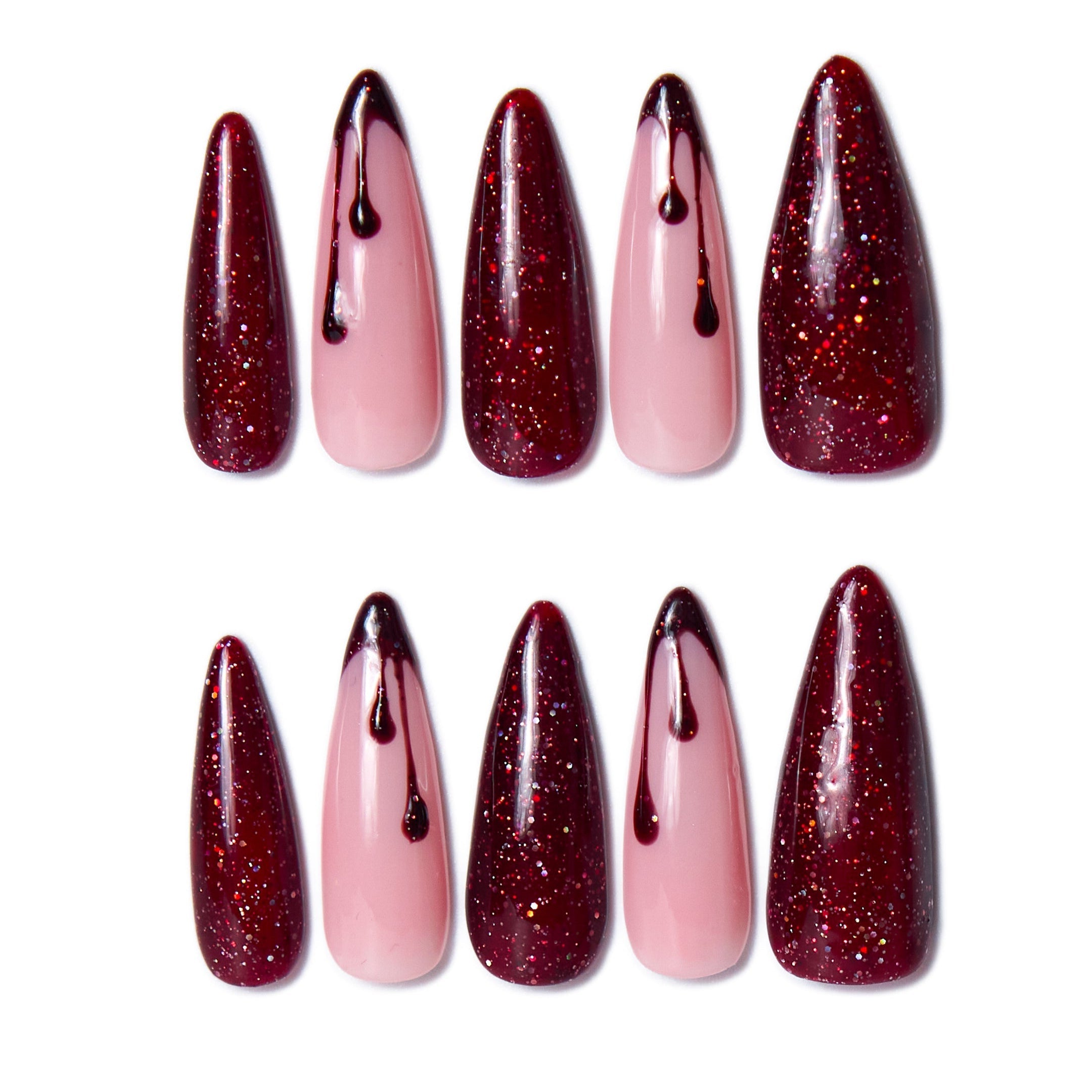 These nails feature a deep, dark burgundy glitter that exudes a sense of luxurious intensity. Interspersed among the glitter are soft pink nails with a unique, dripping effect, creating a striking contrast that's both edgy and feminine.