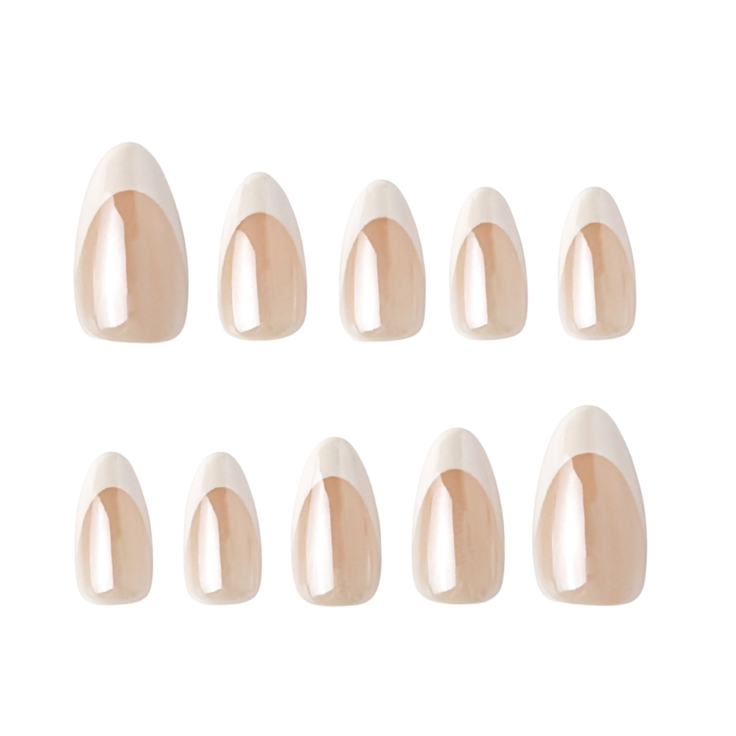 A perfect French ombre design with a pure iridescent white base. The seamless transition to translucent white at the tips creates a subtle yet striking contrast, highlighting the natural shape of your fingers. This set is ideal for classic French nails, wedding nails, and everyday chic.