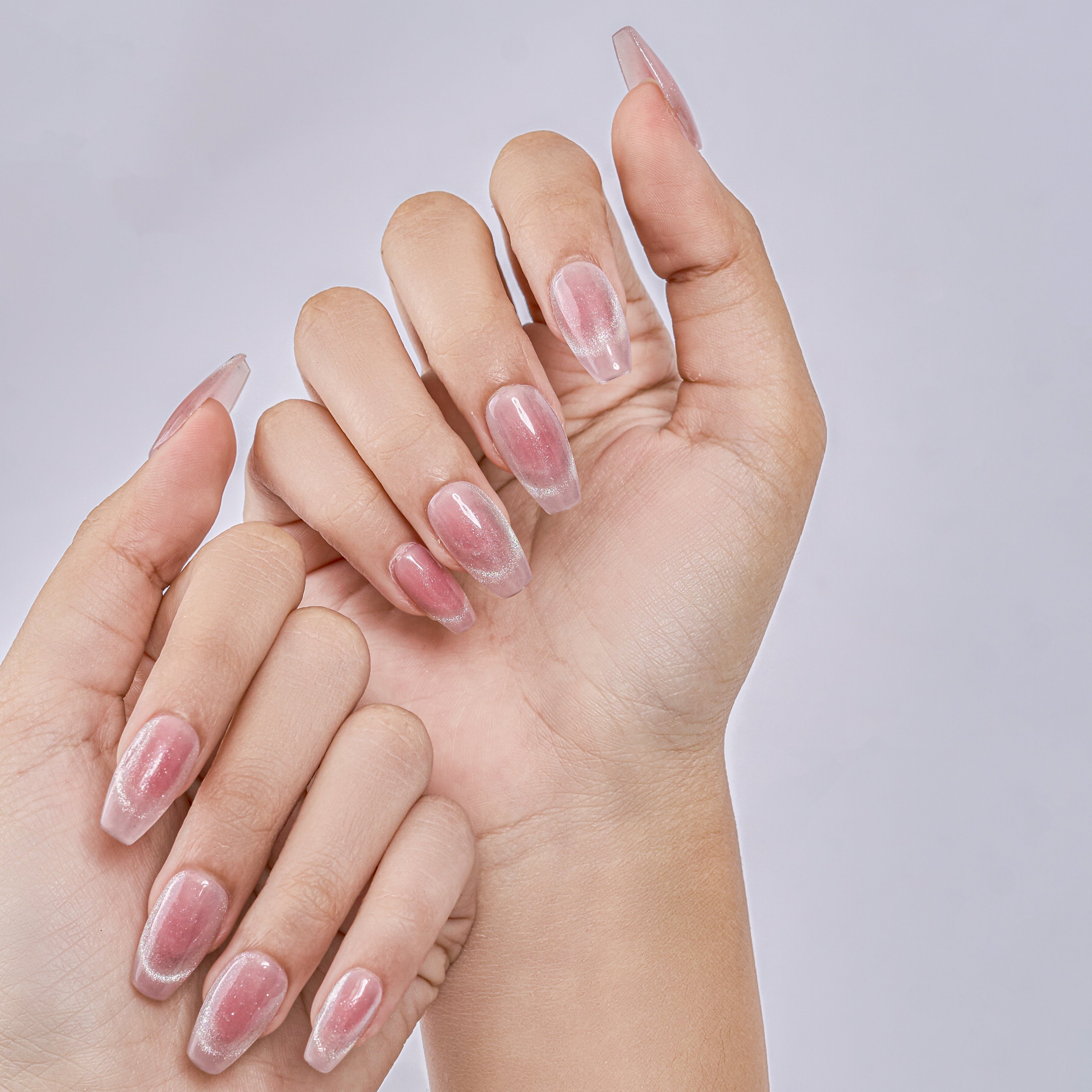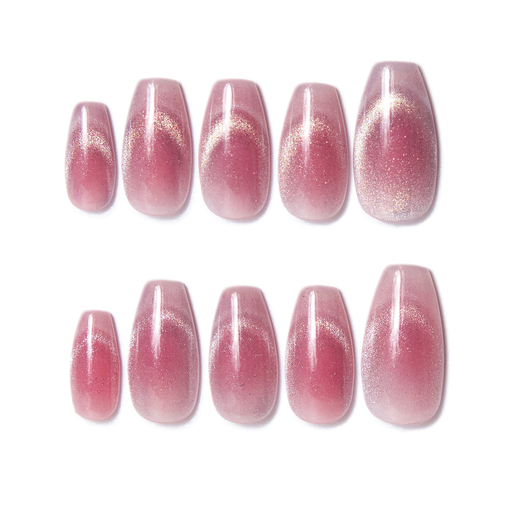 The center ombre effect, transitioning from a deeper pink at the center to a lighter hue at the edges, creates a captivating depth. The subtle cat-eye shimmer, shifting with the light, adds a mesmerizing, almost celestial glow.