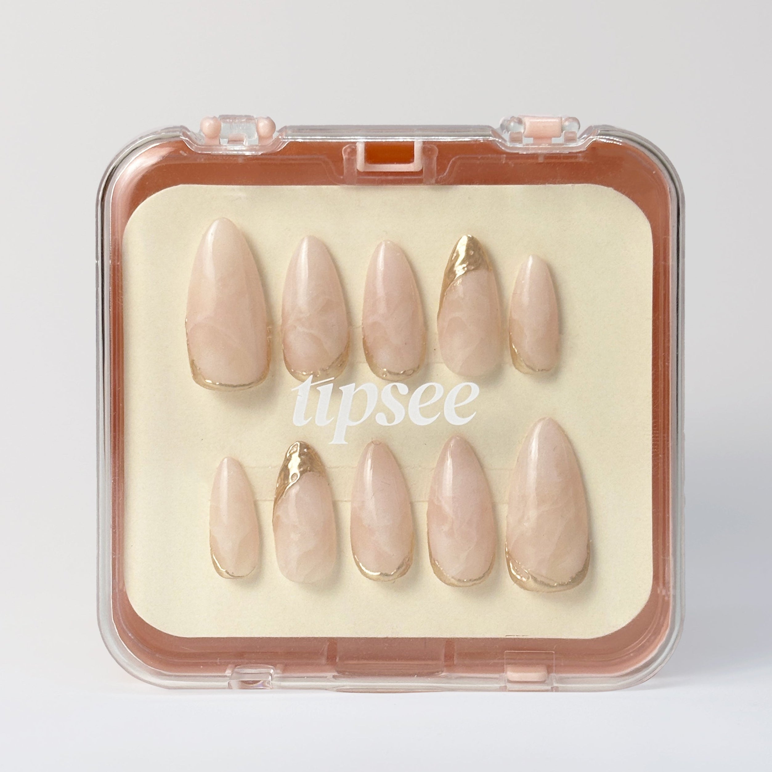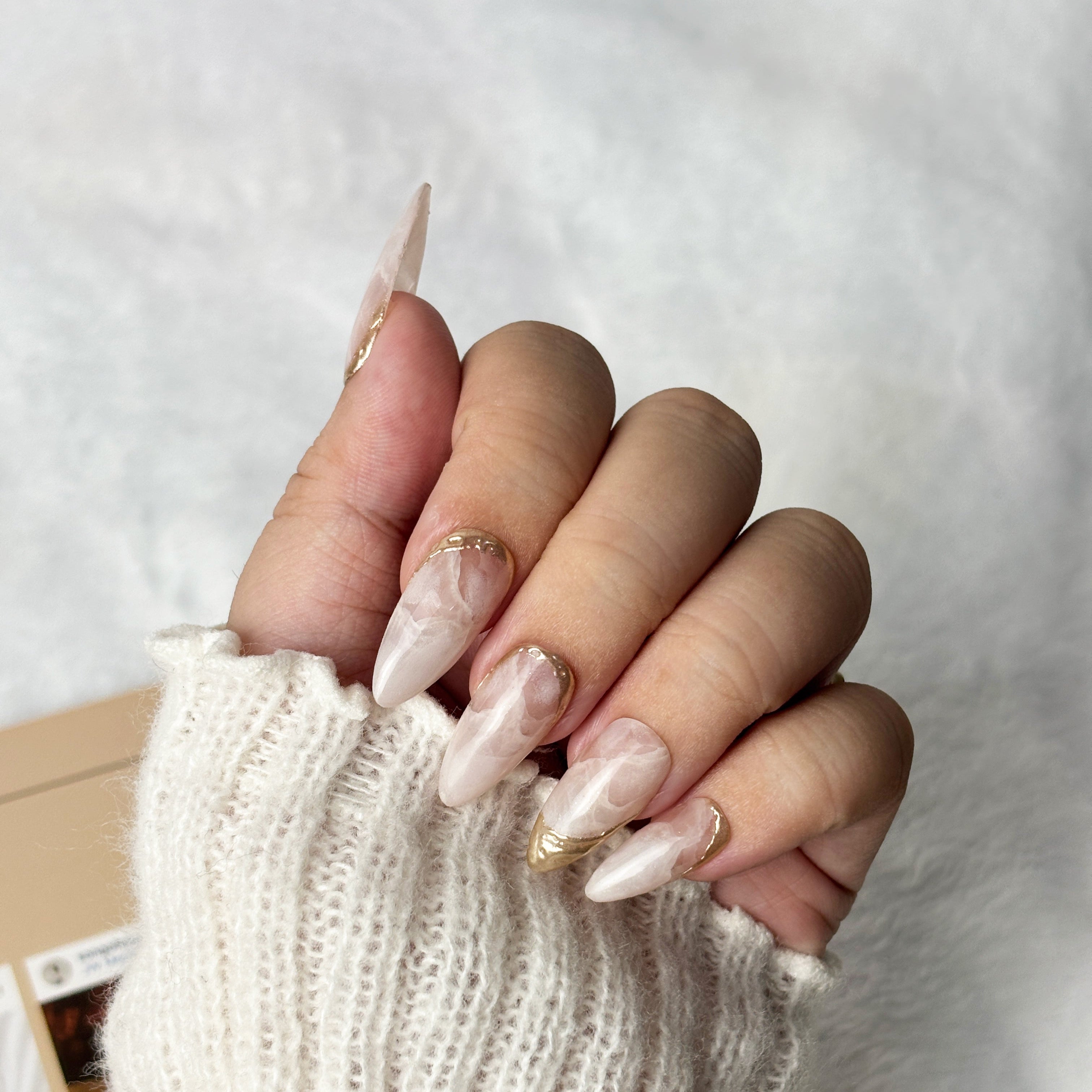 These nails feature a delicate marbled pattern in soft, pearlescent tones, creating a subtle and captivating design. Delicate gold accents trace the cuticles, adding a touch of opulent detail.