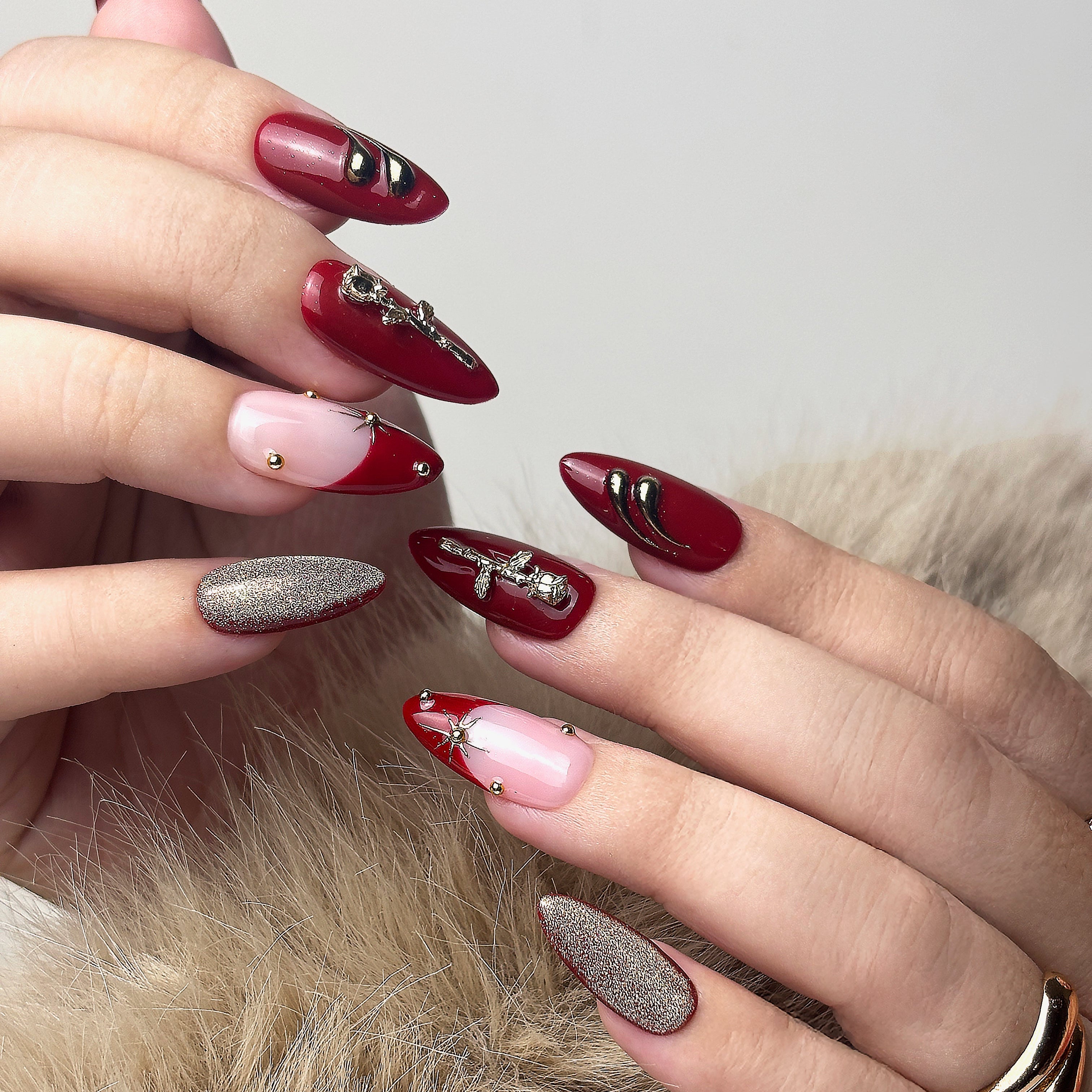 This set features a luxurious almond shape in a rich, romantic color palette of deep ruby red, nude pink, and metallic gold.