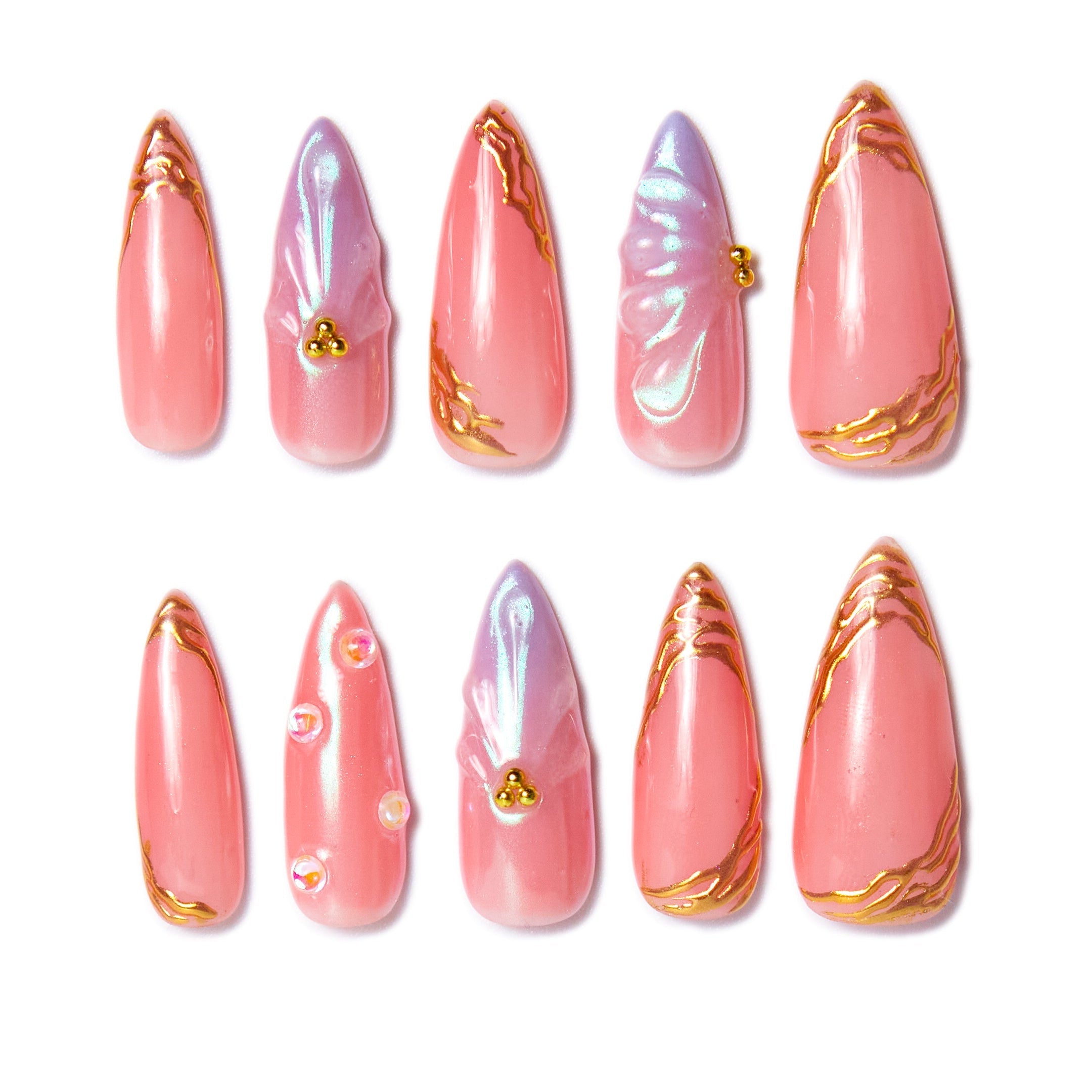 This design features a soft, iridescent base that shifts in color with every movement, adorned with delicate gold filigree accents that trace elegant patterns along the tips and sides. Sparkling gems are strategically placed to catch the light, adding a touch of celestial shimmer.