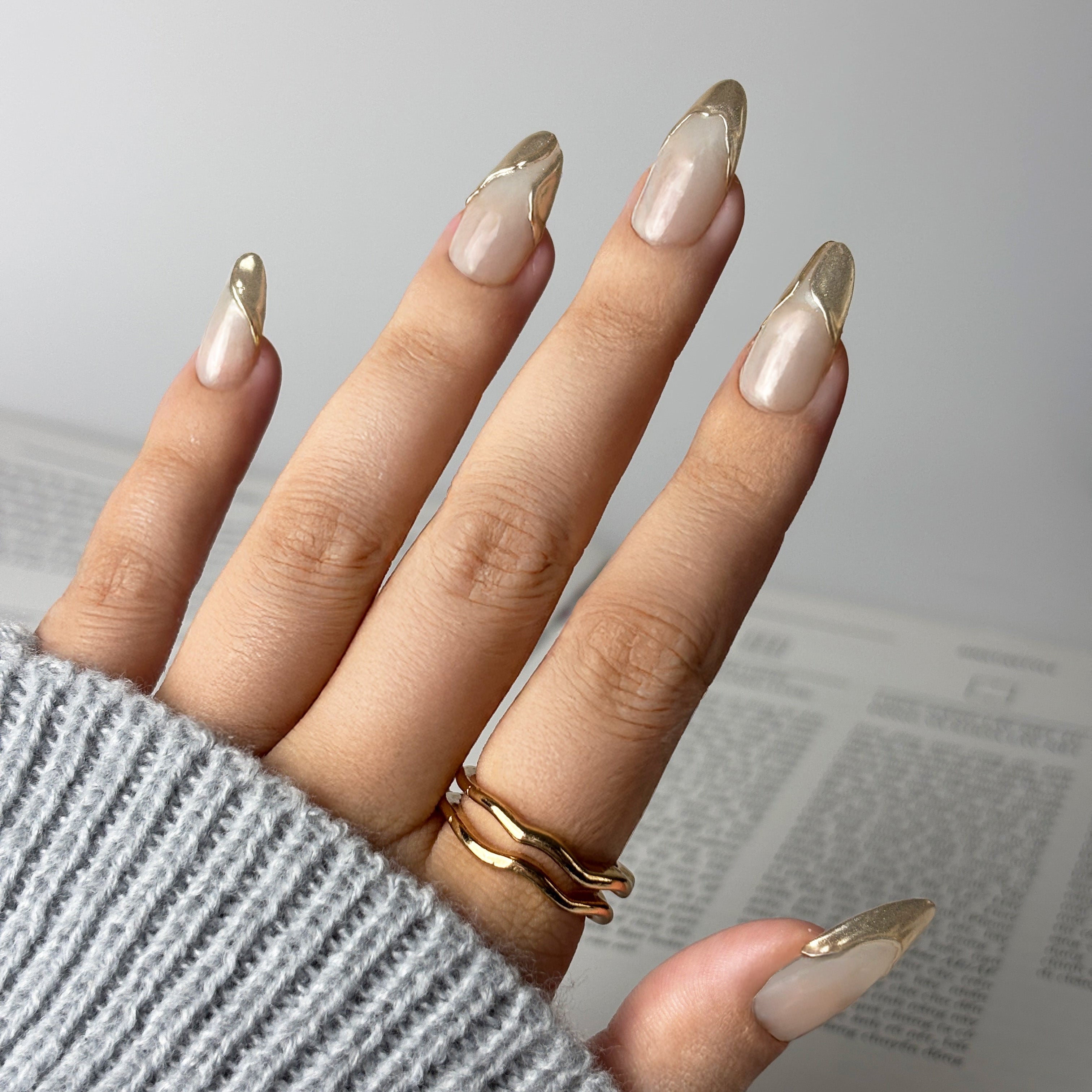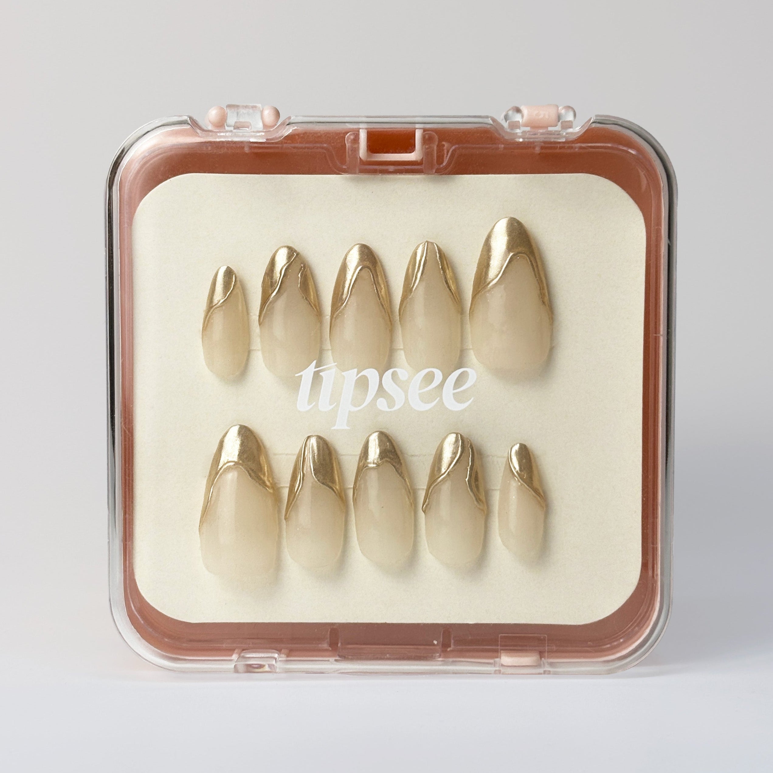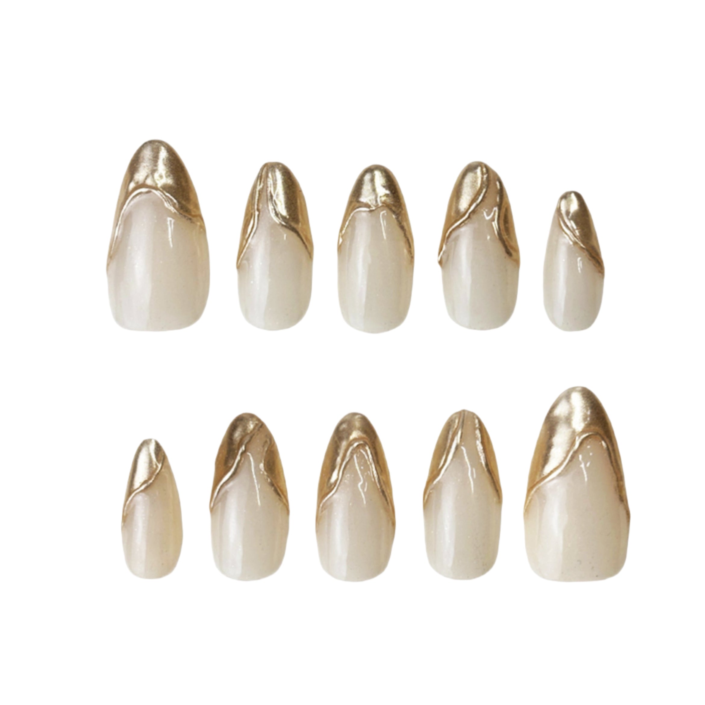 These nails feature a sheer nude base that seamlessly blends with your natural skin tone. Striking gold tips, crafted with a sharp, angular design, create a bold and eye-catching look.