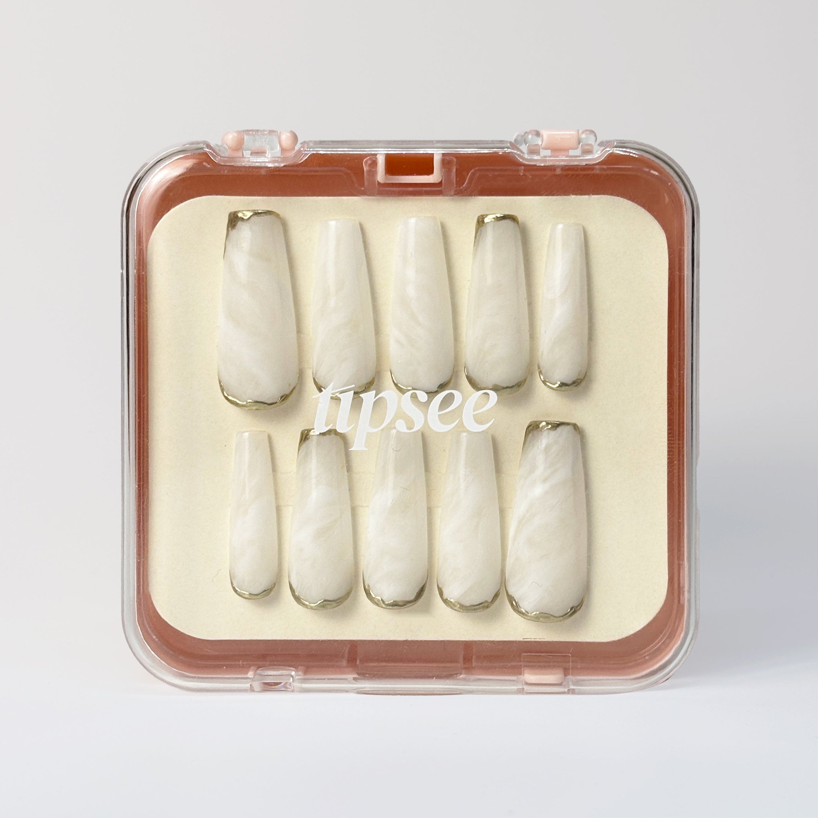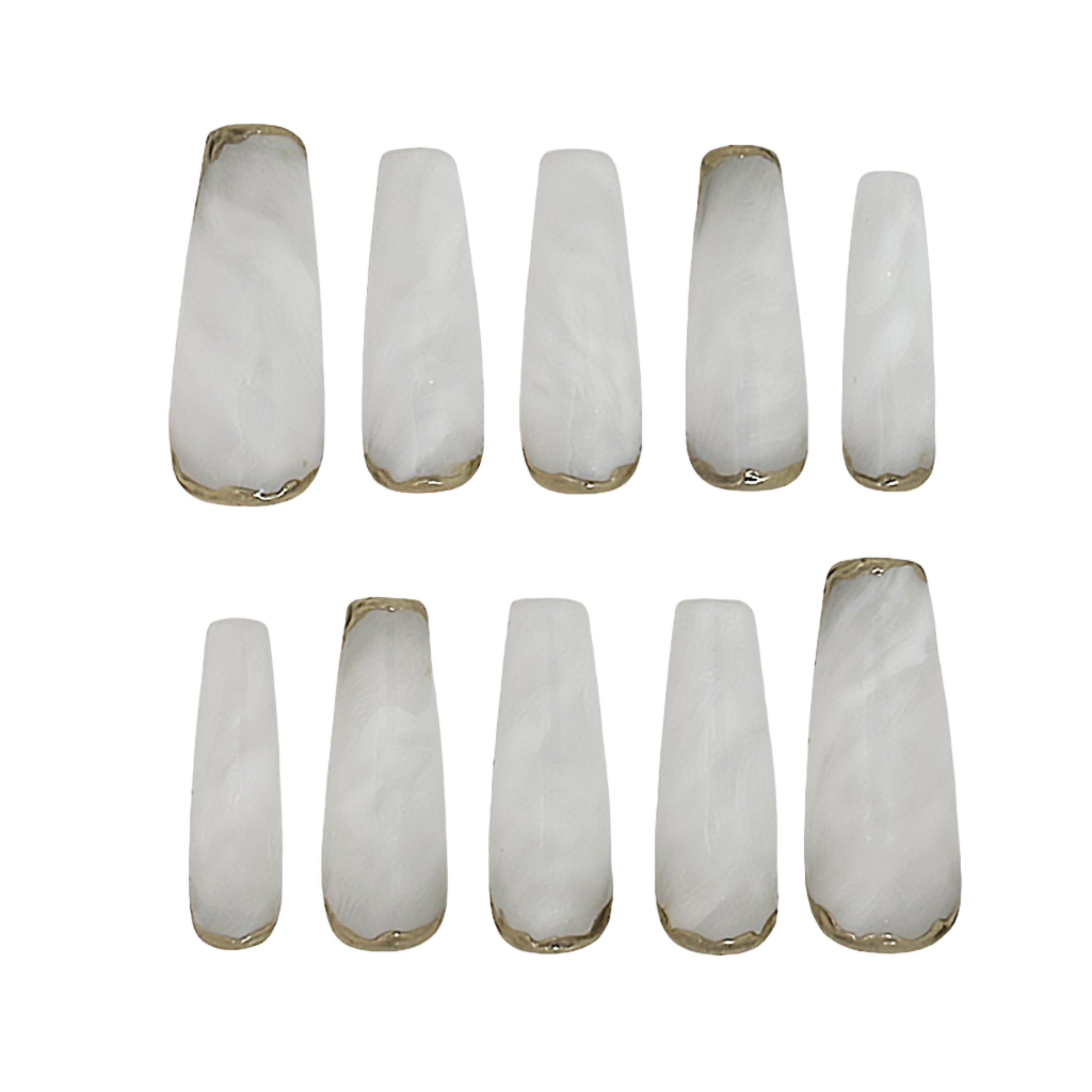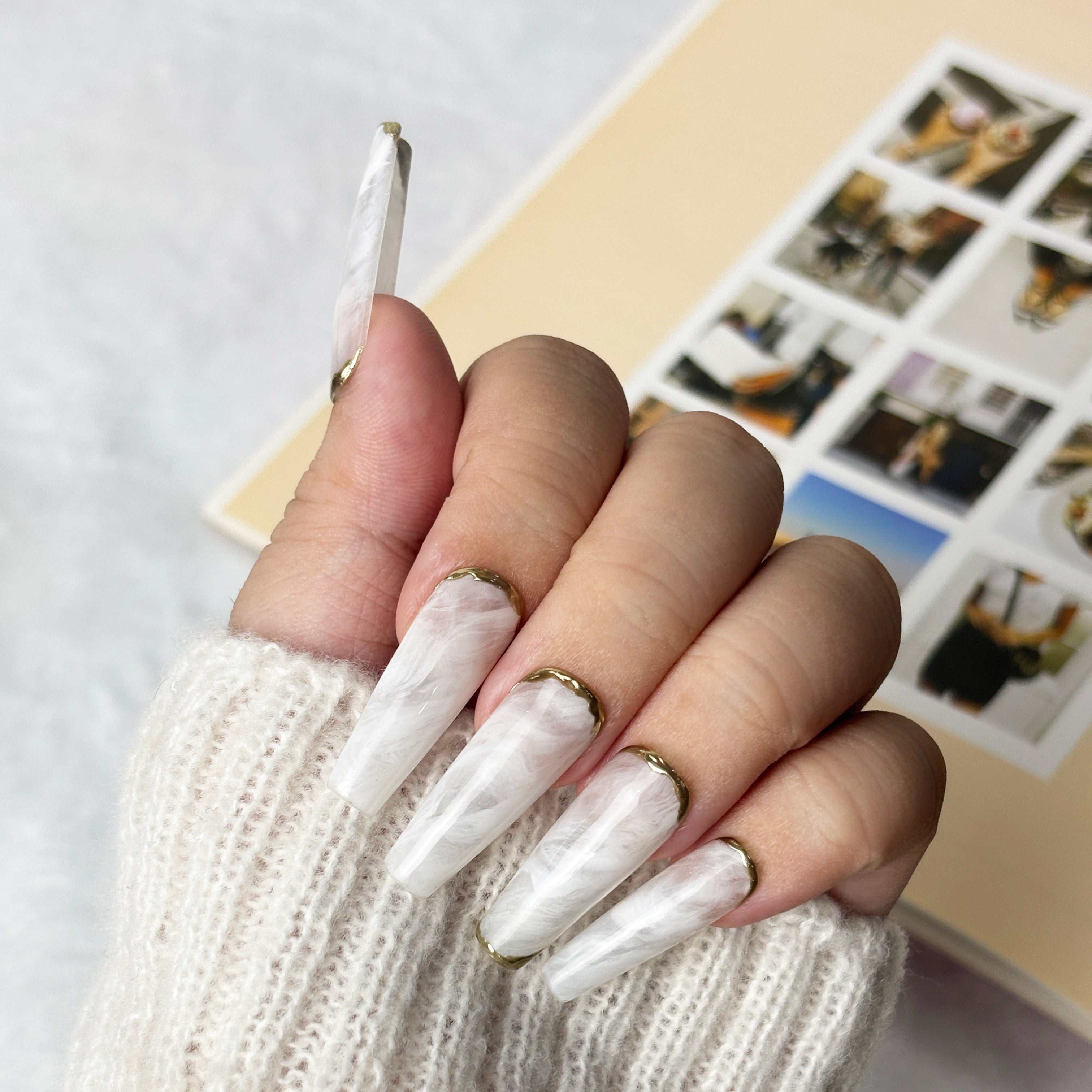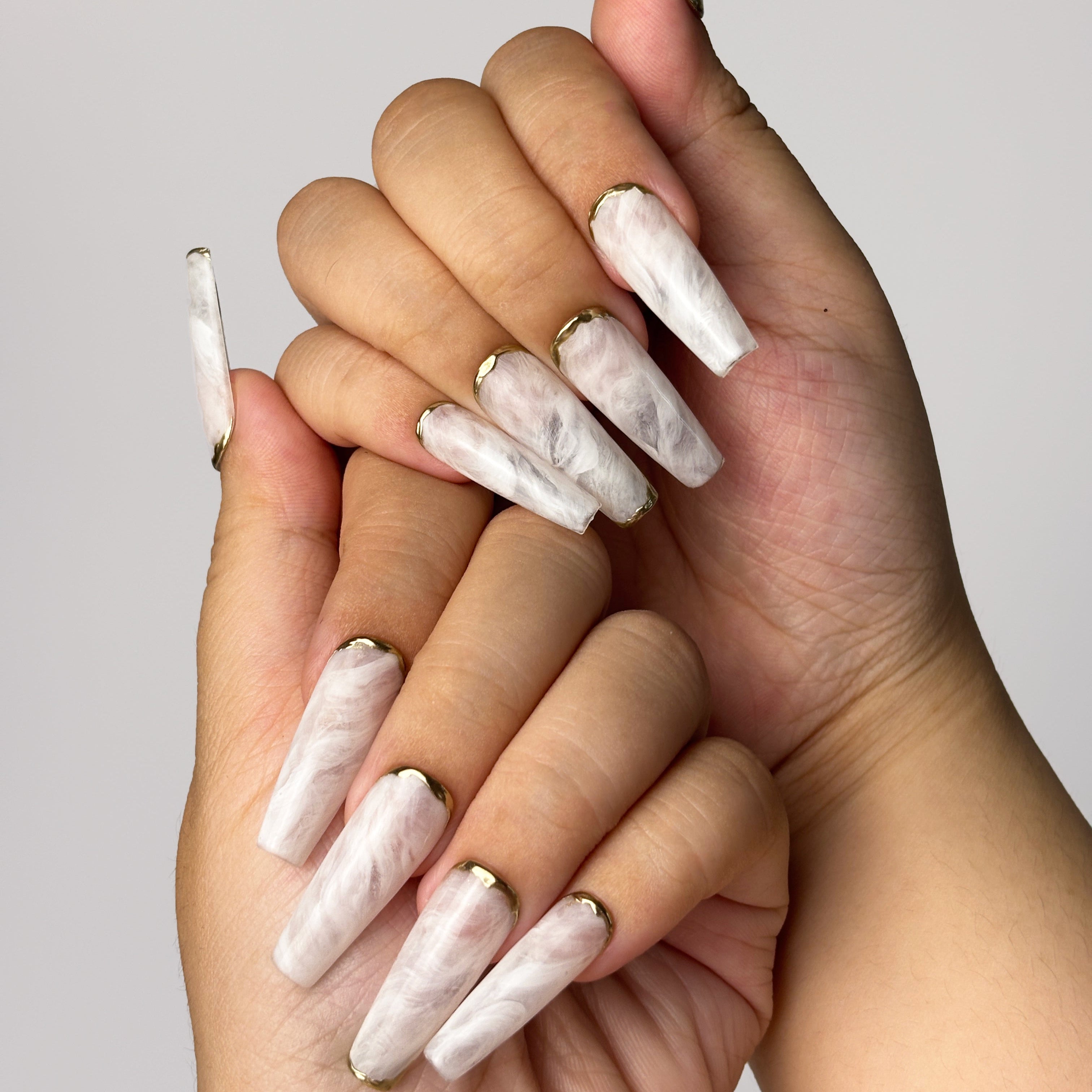These nails feature a captivating marbled pattern in soft, creamy tones, creating a sophisticated and timeless look. Delicate gold accents trace the cuticles, adding a touch of opulent detail.