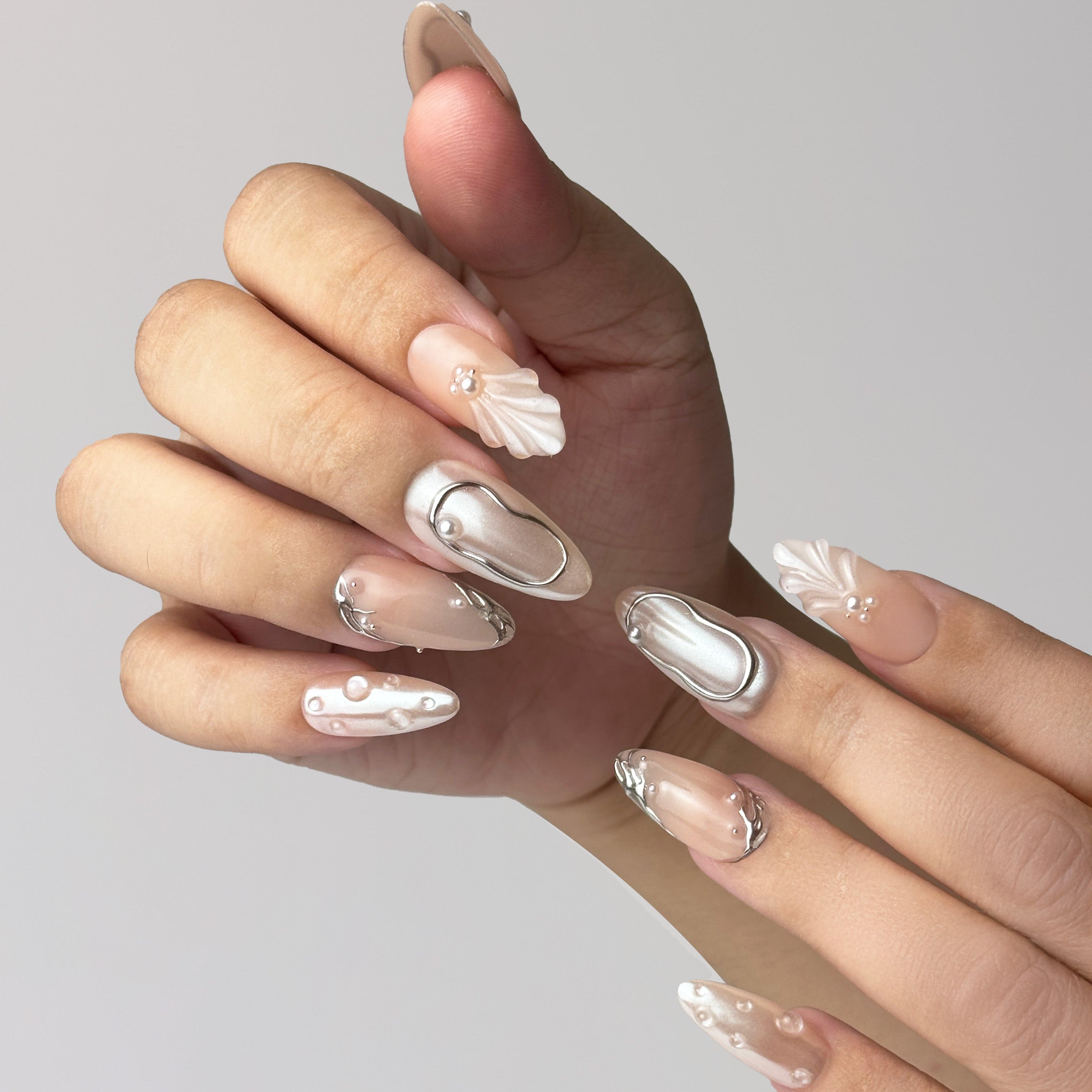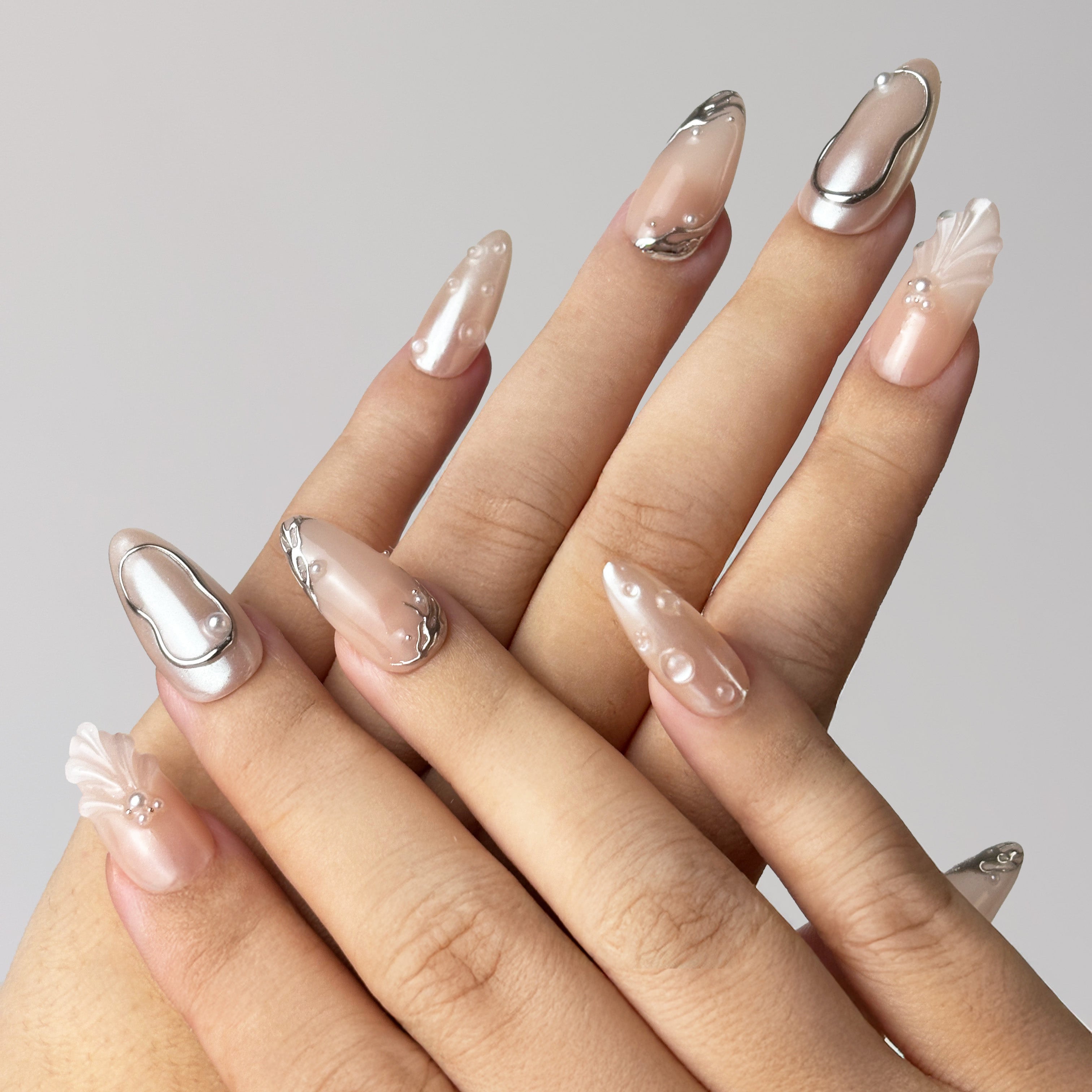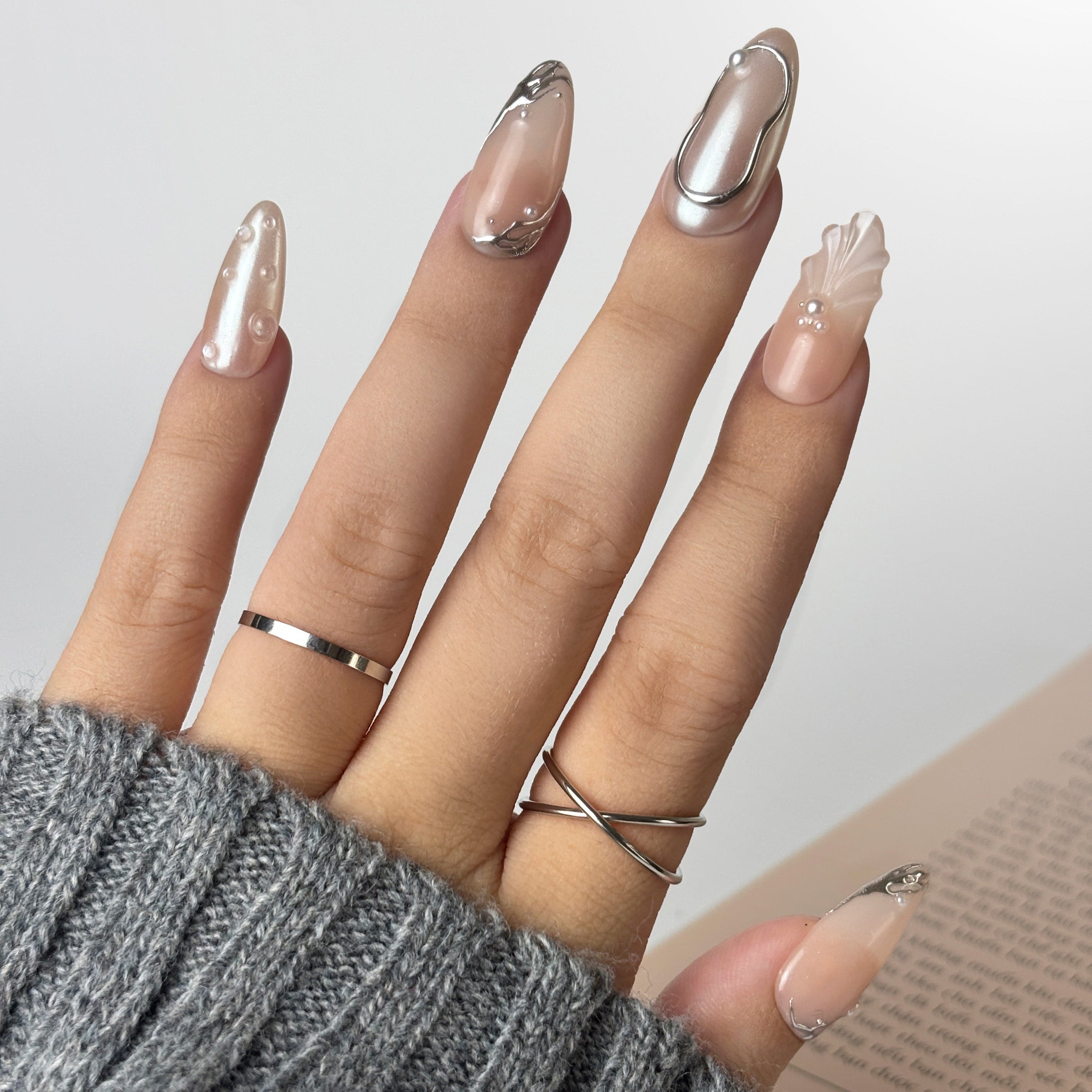 Unique 3D embellishments, resembling soft clouds, add a touch of sculptural artistry. Delicate silver outlines trace the edges of some nails, adding a touch of celestial sparkle.
