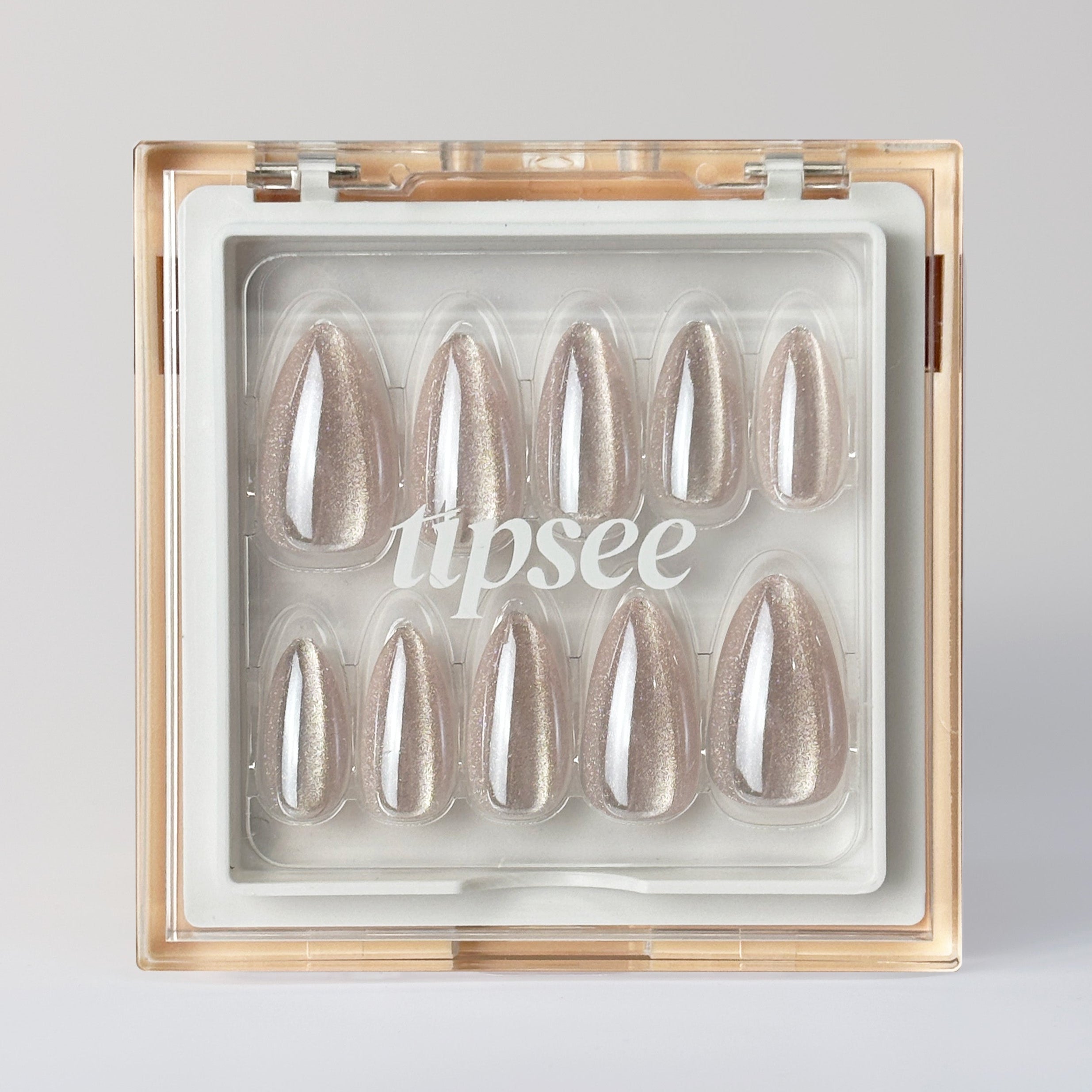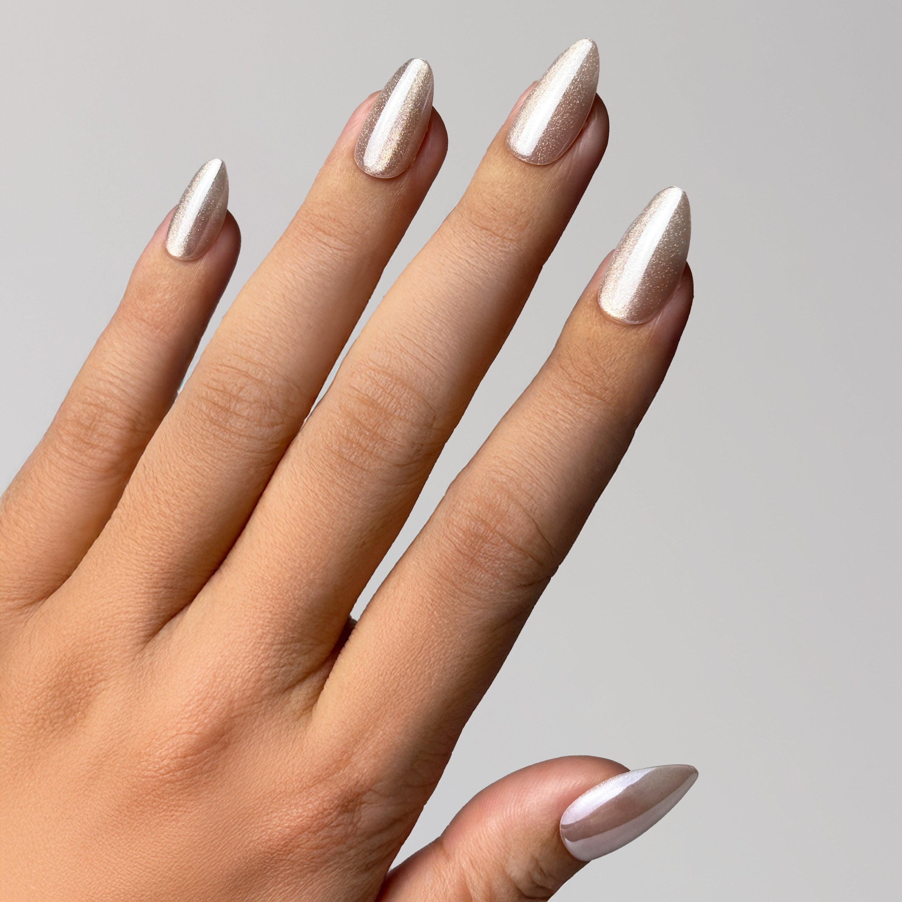 This press-on design features a simple, pure iridescent white base. The subtle light-catching shimmer and unique prismatic effect give the nails a refined sparkle under any light, creating a luxurious and clean feel. This is a perfect choice for minimalist nails and the clean girl aesthetic.