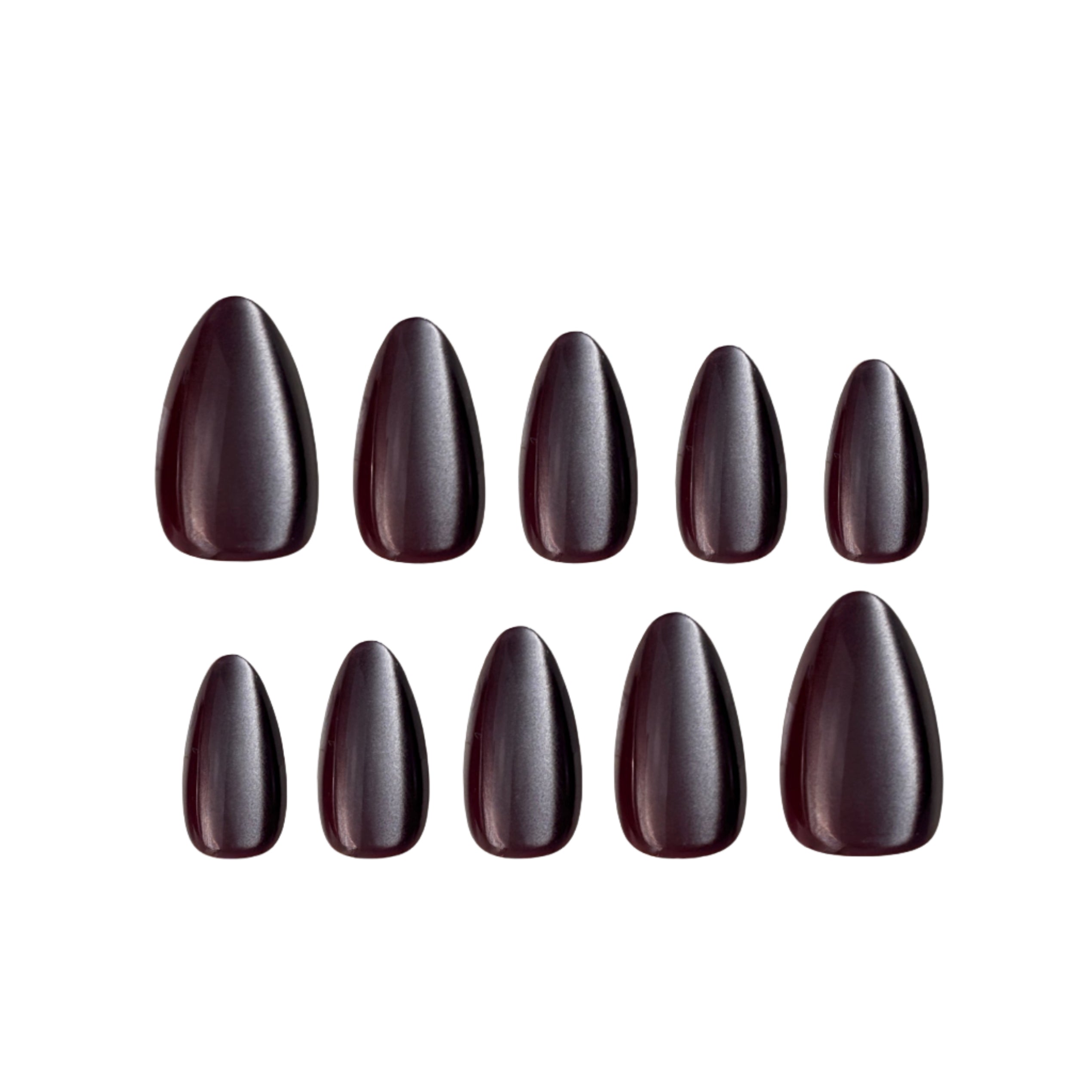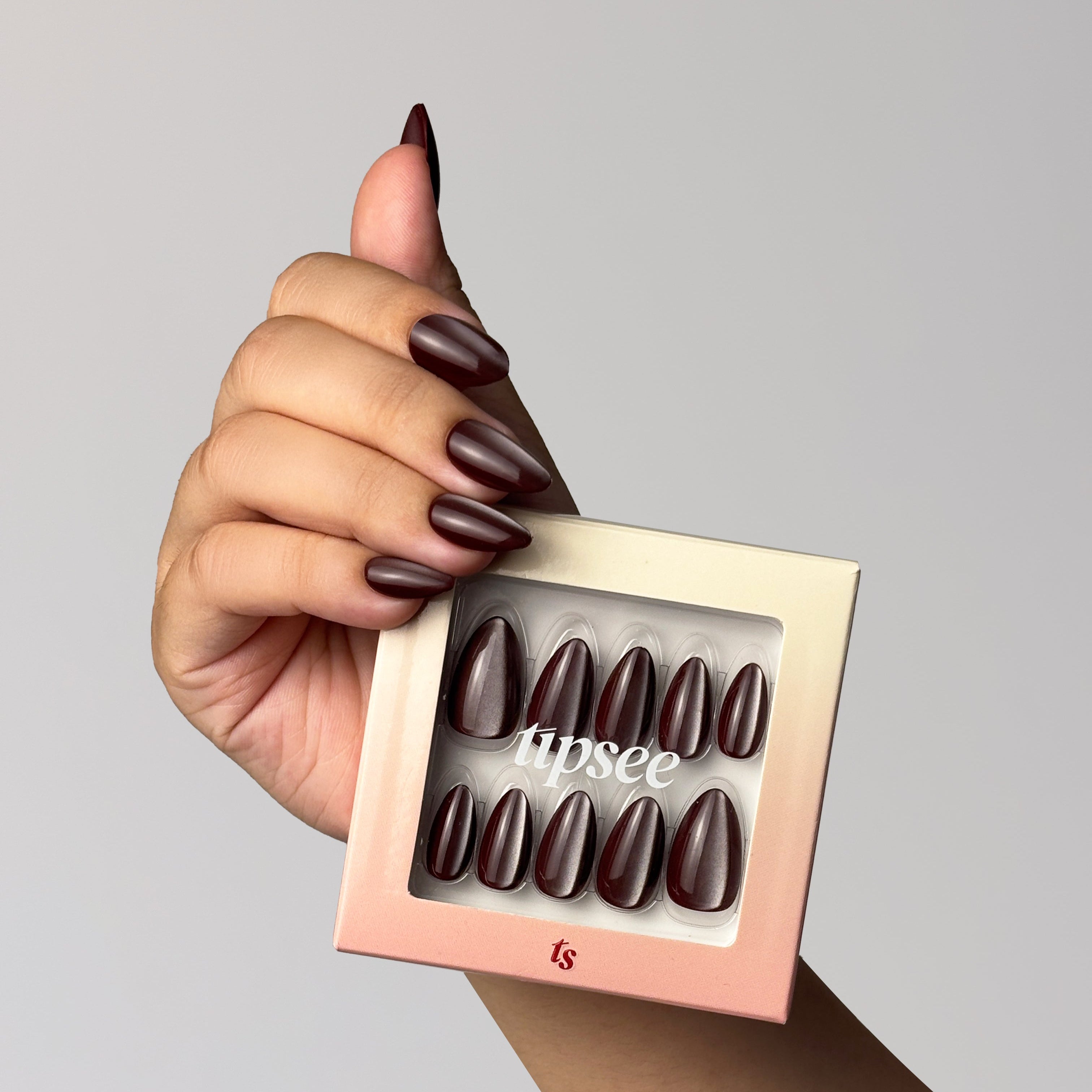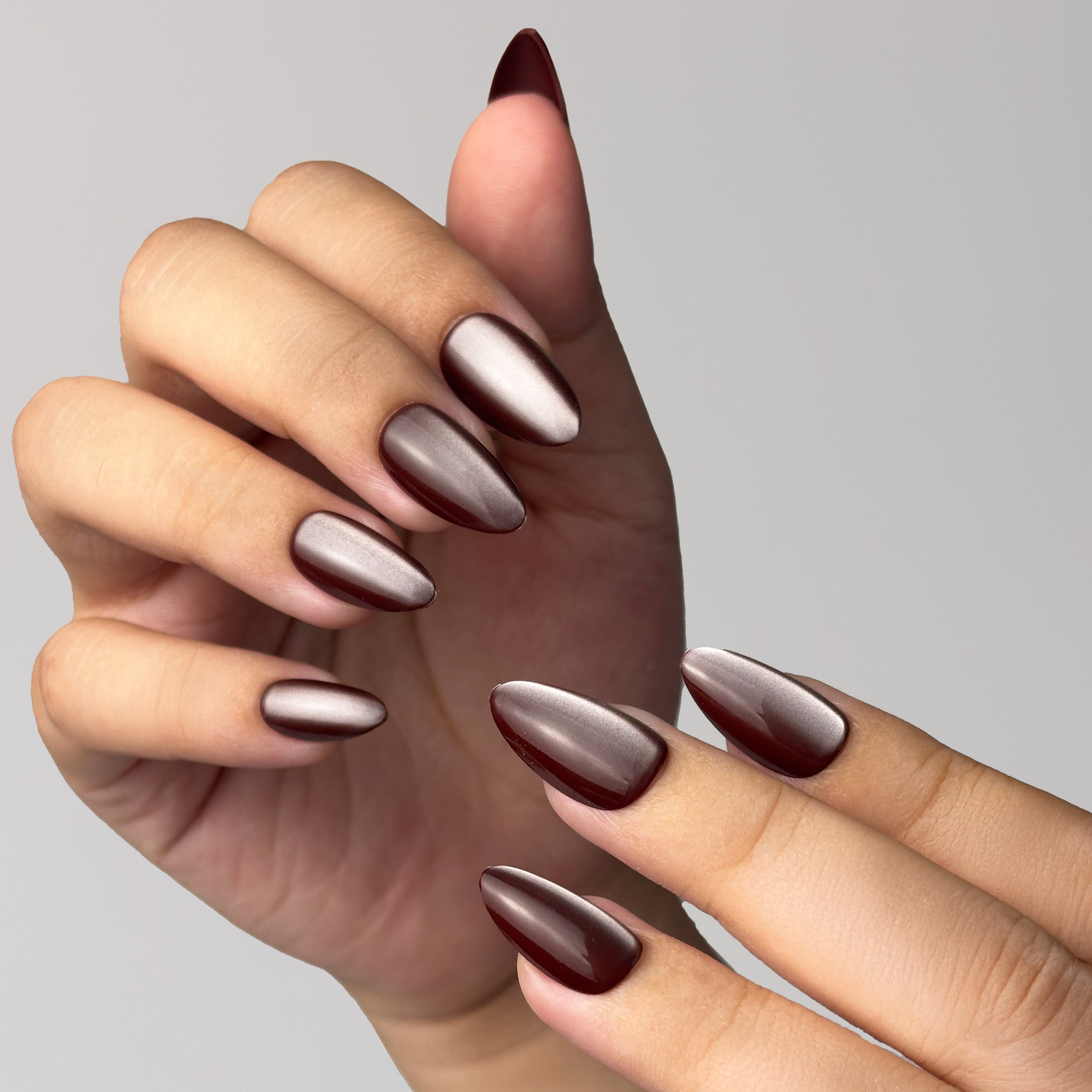 A unique design with a captivating burgundy red and chocolate brown base, combined with a mystical, shimmering cat-eye effect. The multi-faceted shimmer shifts with every angle, creating a luxurious, enchanting, and magical look. This is the perfect choice for the dark aesthetic, grunge glam, and sultry nails.