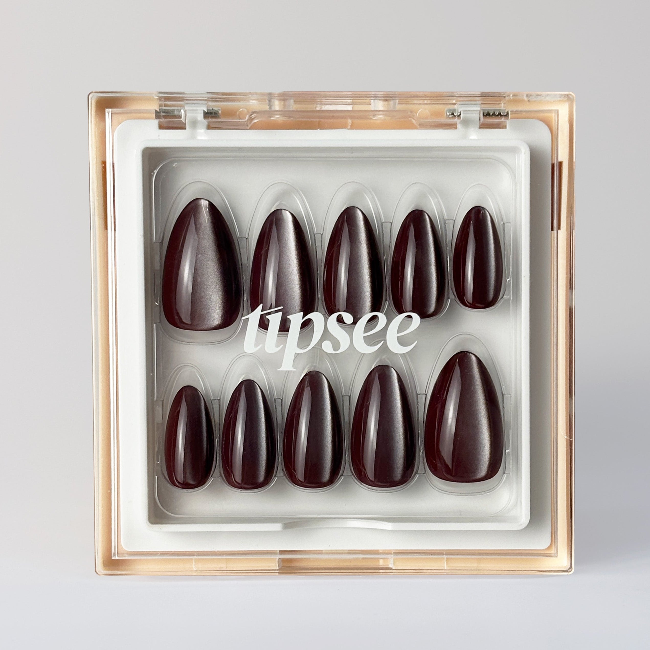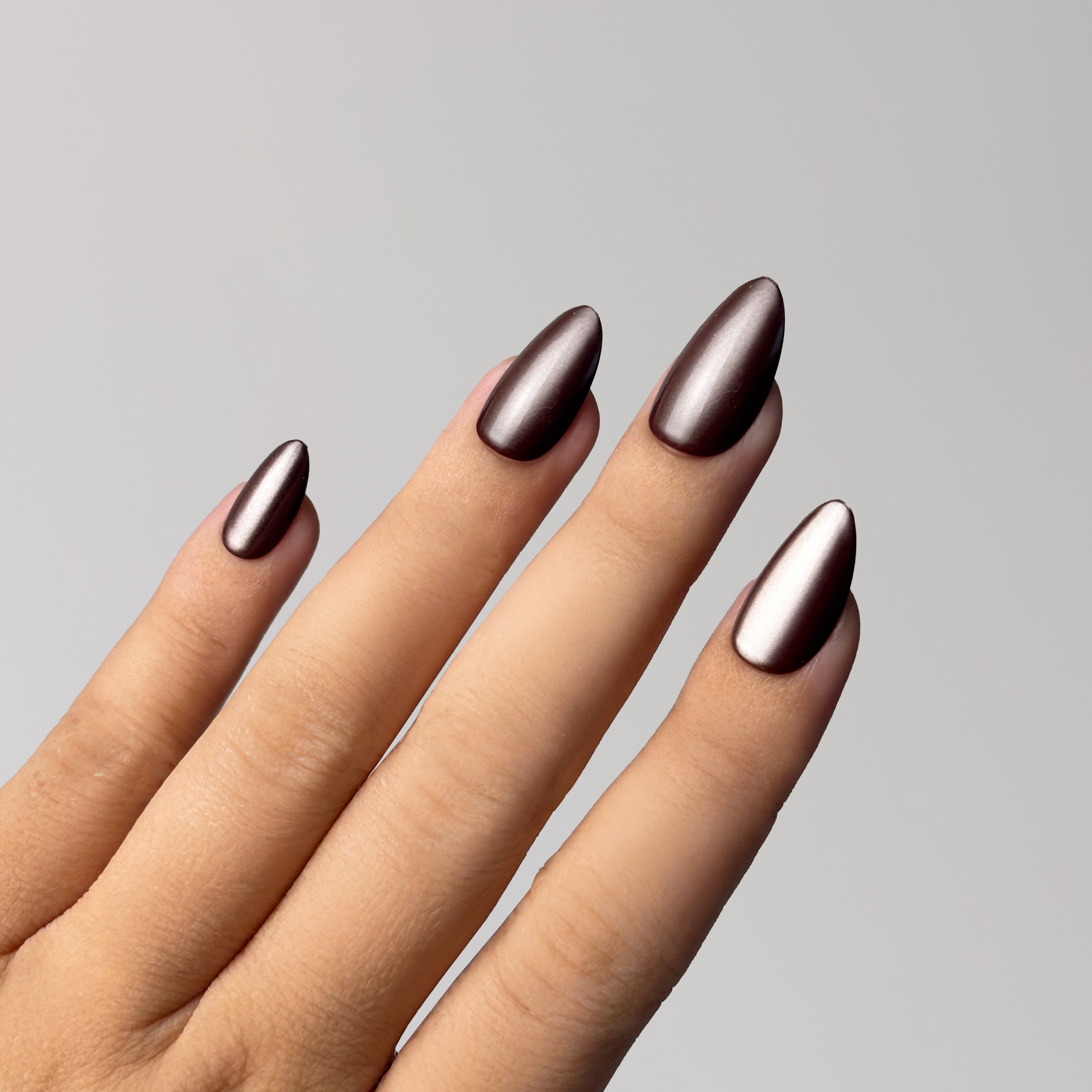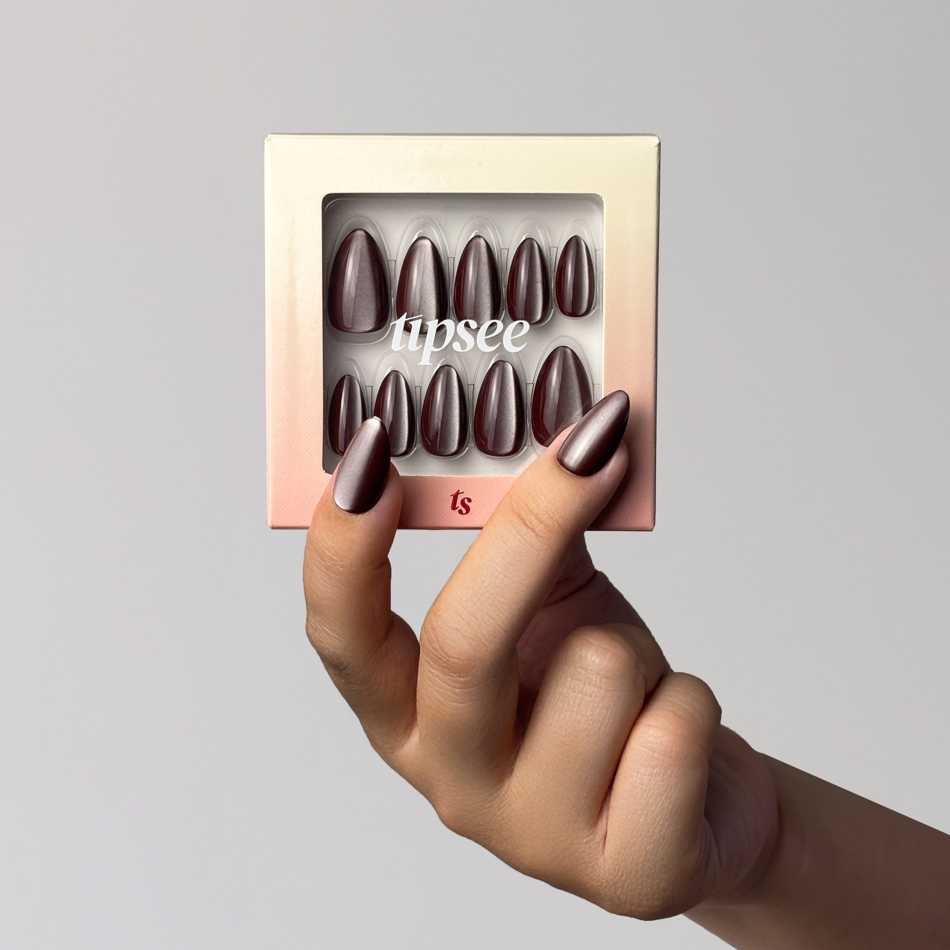 A unique design with a captivating burgundy red and chocolate brown base, combined with a mystical, shimmering cat-eye effect. The multi-faceted shimmer shifts with every angle, creating a luxurious, enchanting, and magical look. This is the perfect choice for the dark aesthetic, grunge glam, and sultry nails.