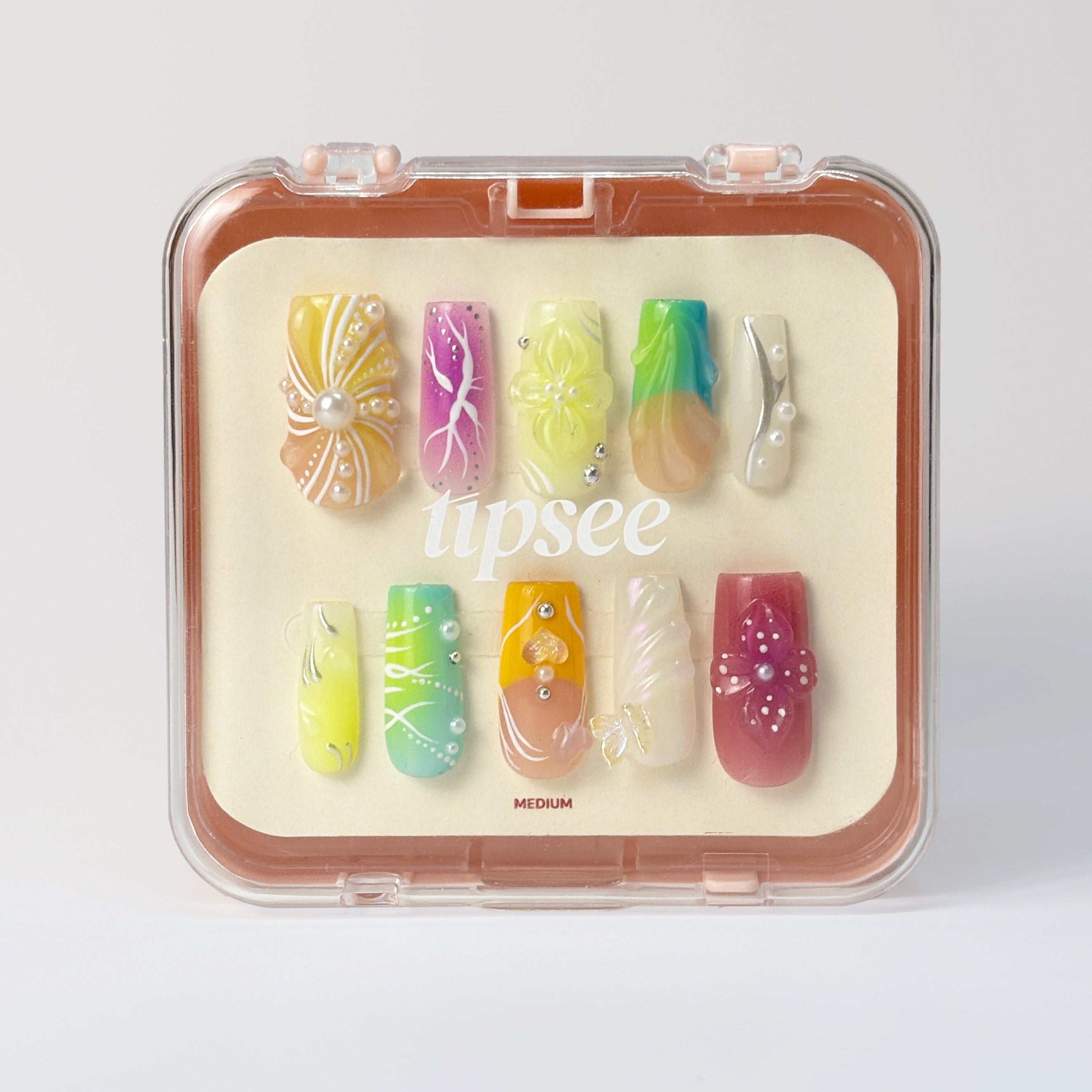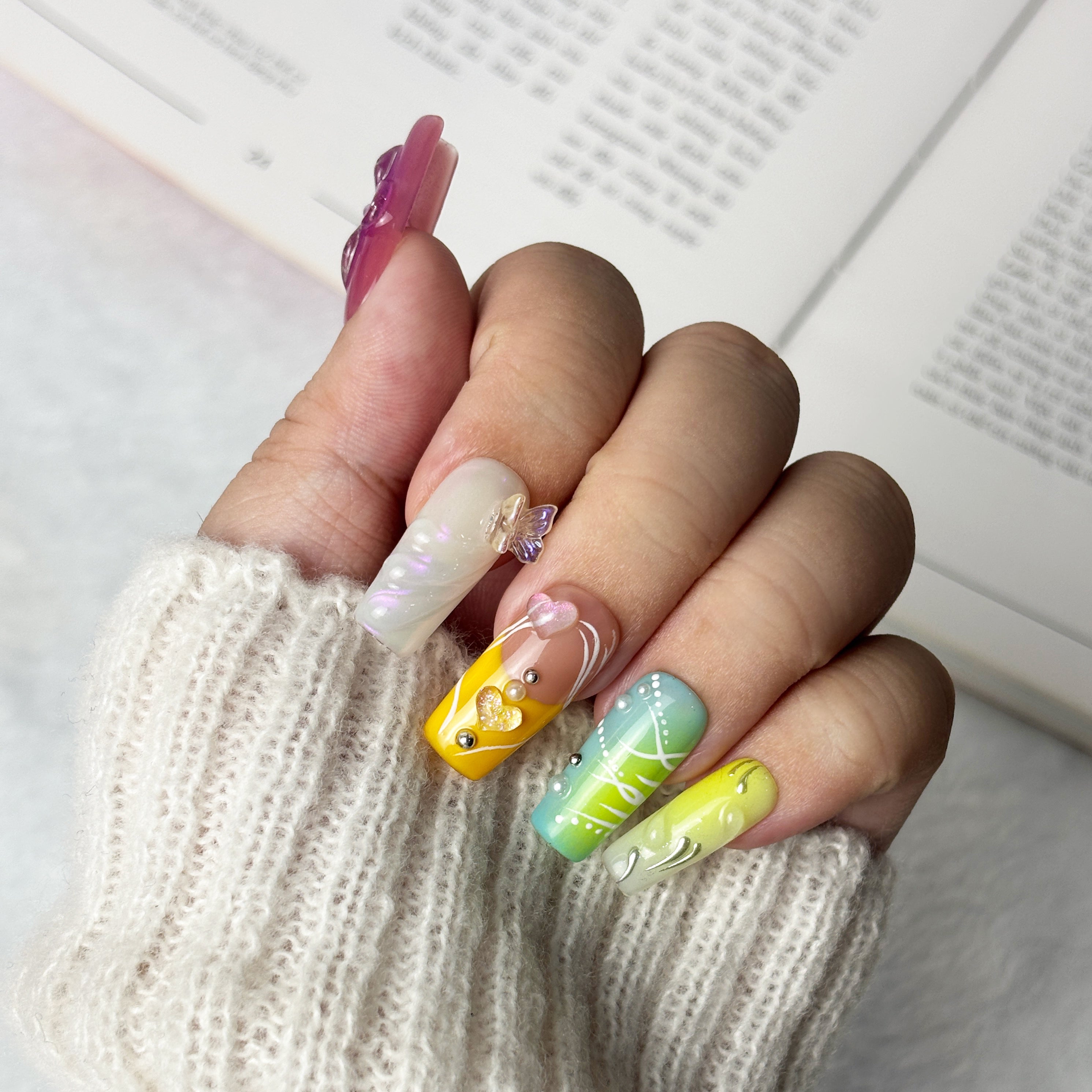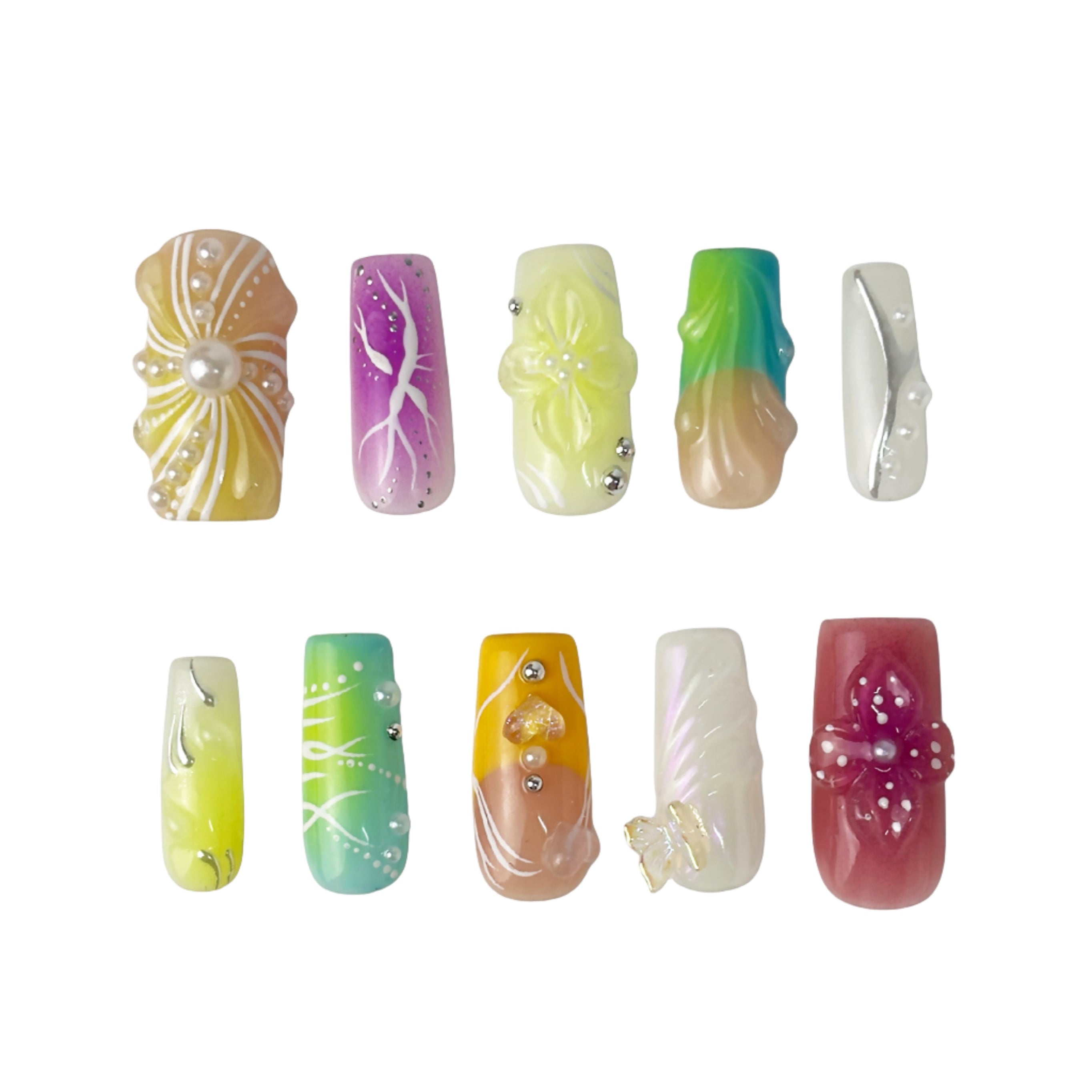 These nails feature a mesmerizing blend of pastel hues with an iridescent shimmer, creating a captivating play of light. Each nail is adorned with unique 3D embellishments, including delicate pearls, sparkling gems, and sculpted floral details, adding a touch of whimsical artistry.