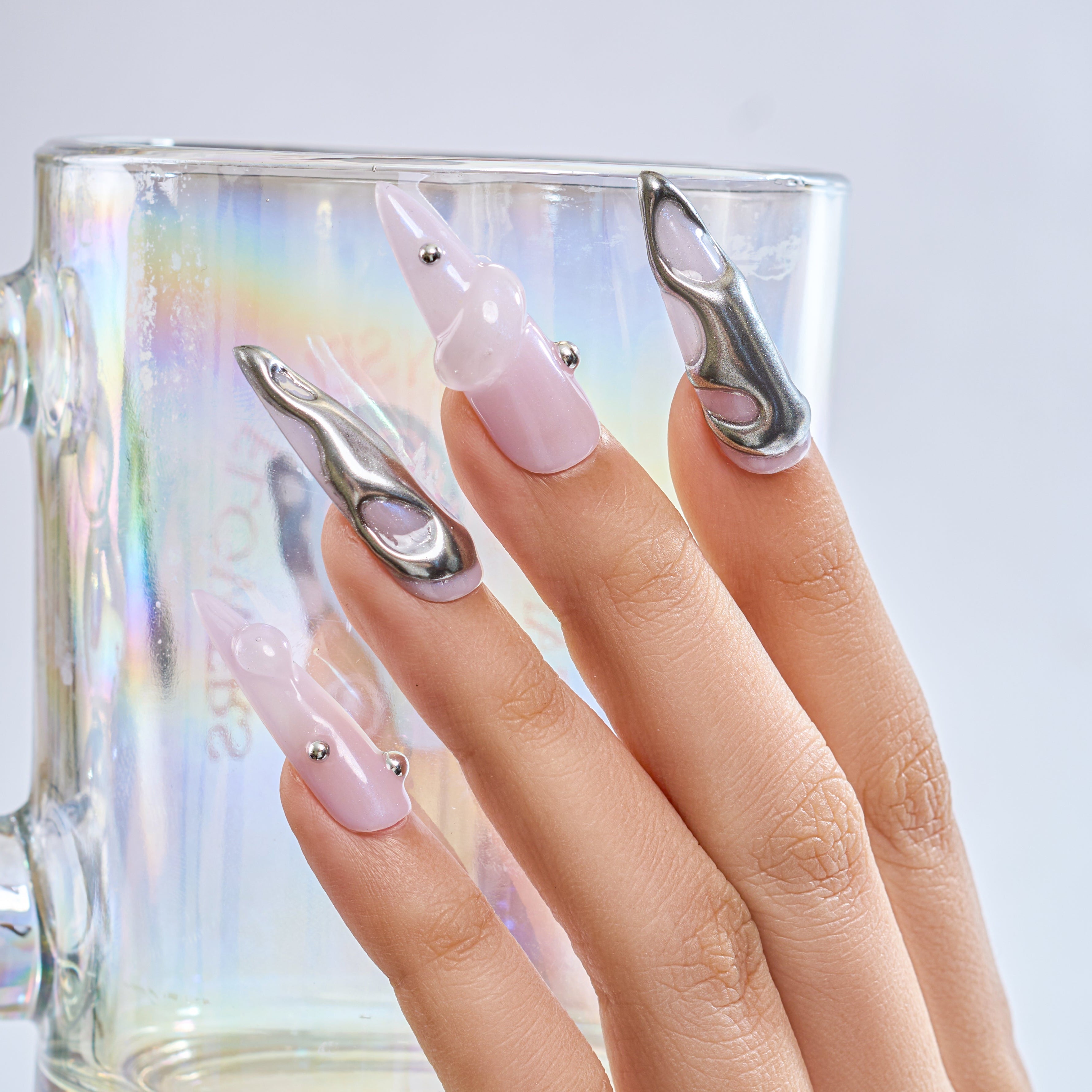 A captivating design, showcasing sculpted chrome accents that create a bold, metallic statement. Interspersed among the chrome are soft, ethereal pink nails with subtle pearl embellishments, perfectly balancing the edgy with the elegant.