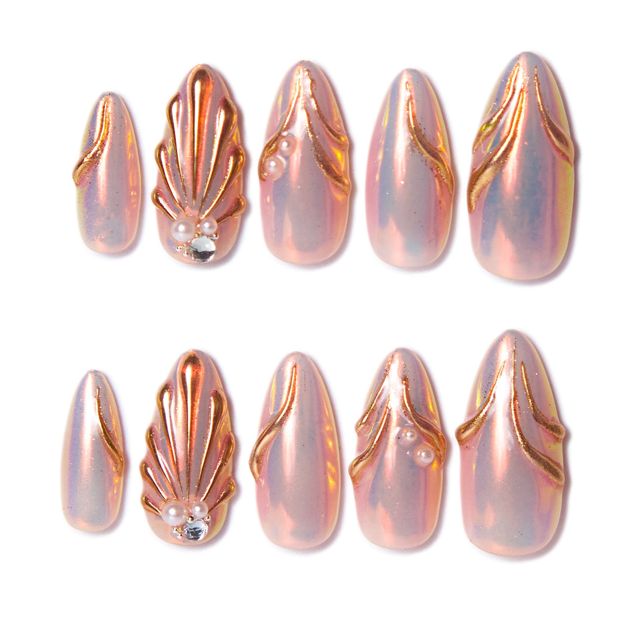 These nails feature an iridescent, almost metallic finish that shifts in color with every movement, creating a captivating play of light. Intricate gold details trace elegant patterns along the tips and sides, adding a touch of luxurious artistry.